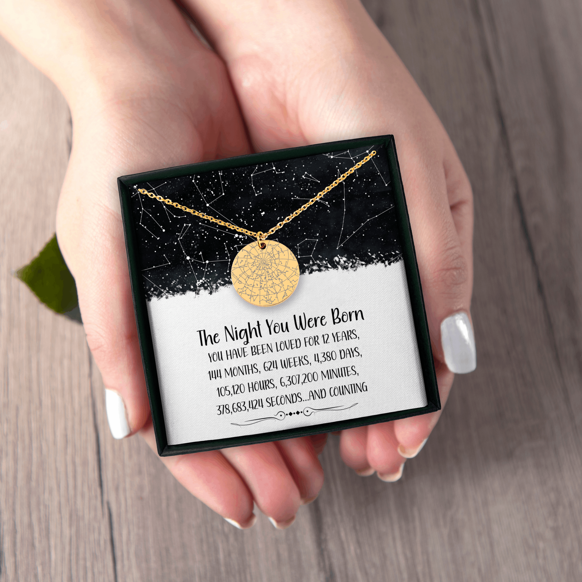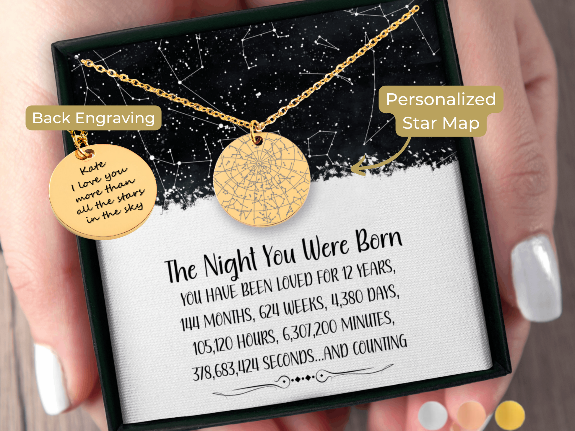 Celebrate her 12th birthday with this custom engraved charm necklace with a Star Map designed especially for her. It's the perfect twelve year old Birthday gift or Christmas gift! Simply add a date and the place she was born, and our designers will customize a star map that shows exactly how the sky was looking on that specific day, from that specific place. Optionally, you can choose to give this meaningful necklace an even more personal touch by adding a custom message, date, or coordinates on the back.