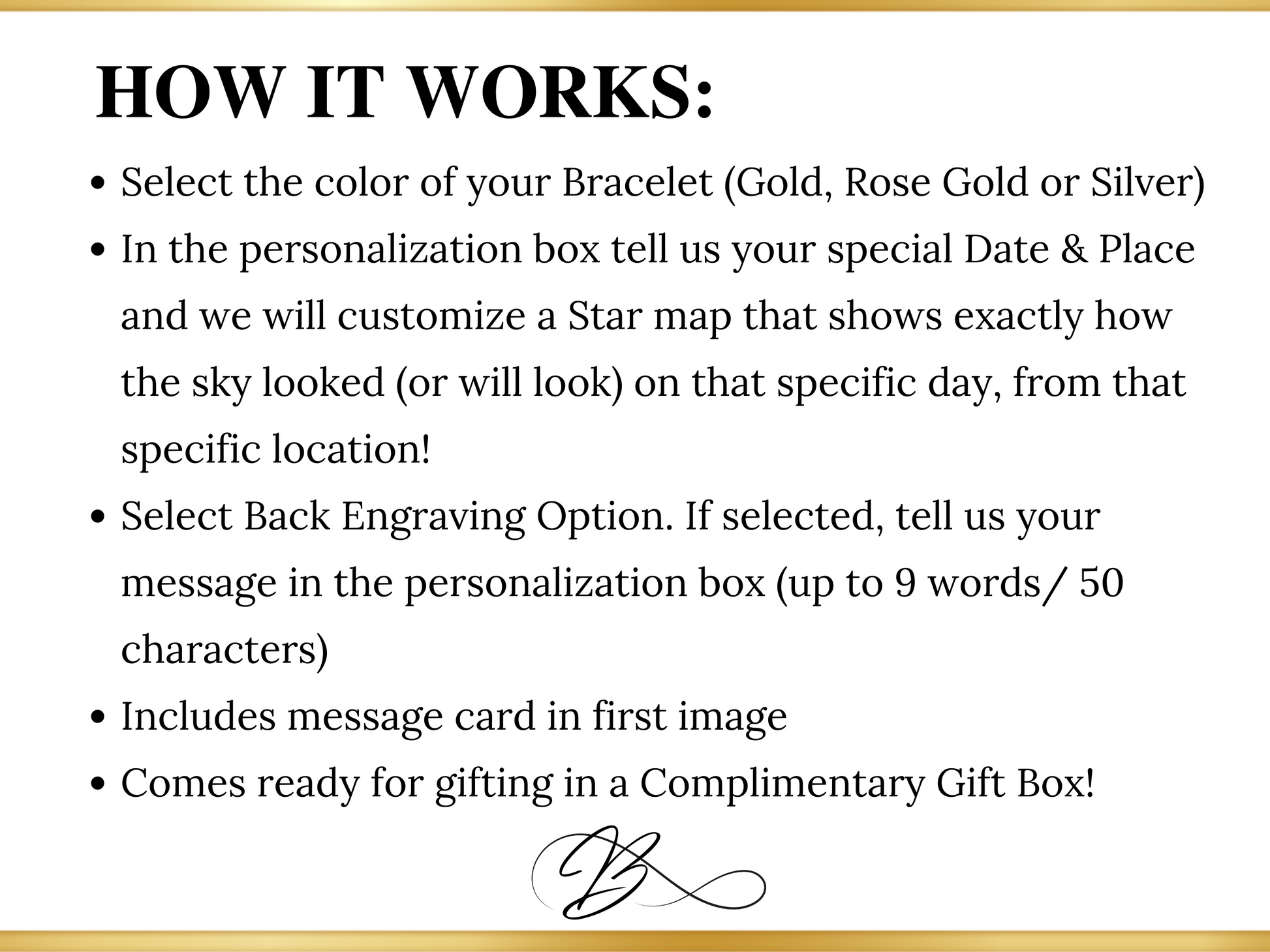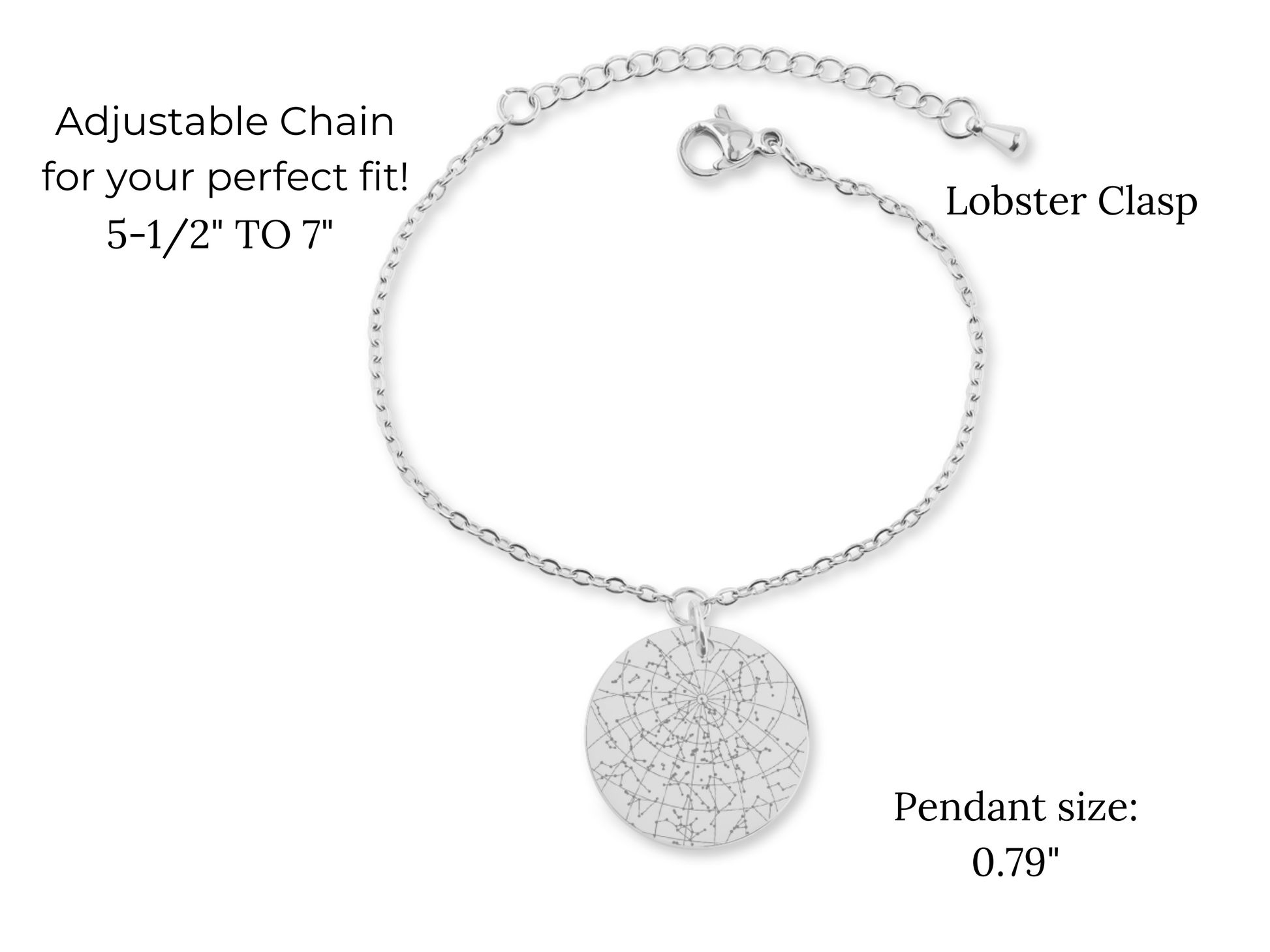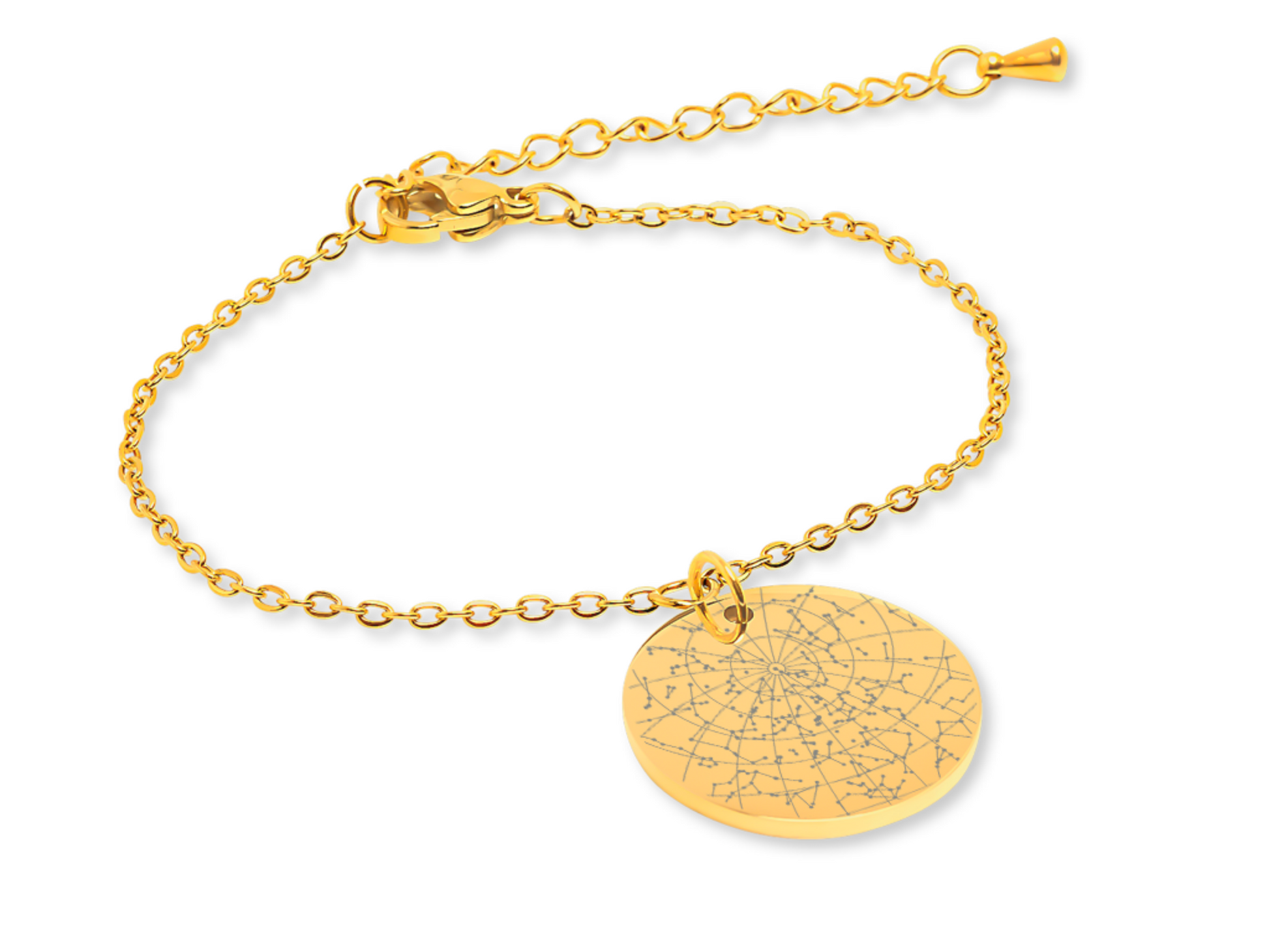 More than just a bracelet…eternalize a special moment in your life with a custom star map bracelet. Was it the day you met your soul-mate, the day you passed an important exam, the birth of a child or the day you realized your world has changed? Simply add a date and a place, and our designers will customize a star map that shows exactly how the sky was looking on that specific day, from that specific place. Optionally, you can choose to give the bracelet an even more personal touch by adding a custom message or coordinates on the back. This bracelet also makes the perfect gift for anniversaries, birthdays, couples & more.