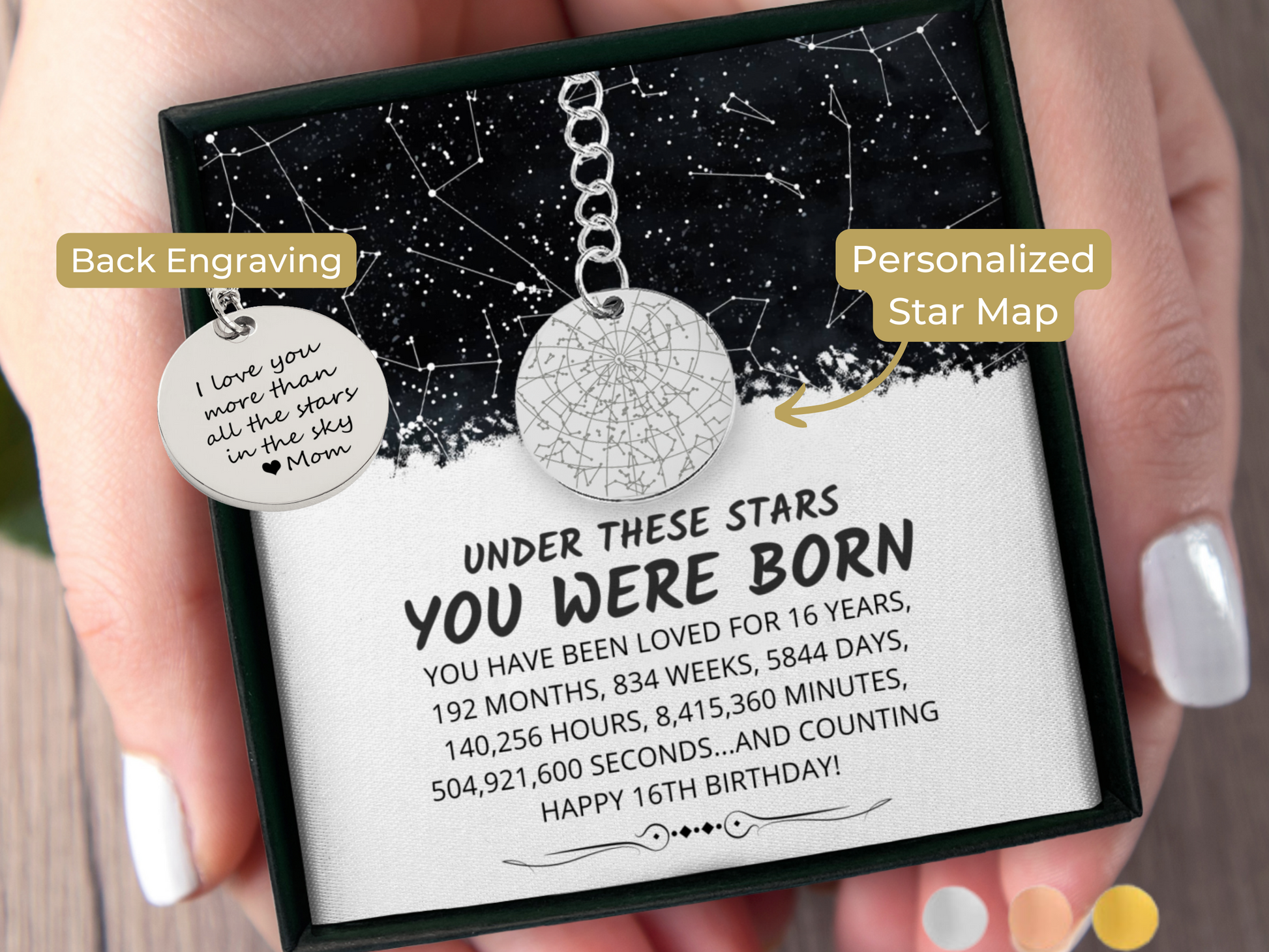 More than just a keychain…eternalize a special moment in your life with a custom star map keychain. Was it the day you met your soul-mate, the day you passed an important exam, the birth of a child or the day you realized your world has changed? Simply add a date and a place, and our designers will customize a star map that shows exactly how the sky was looking on that specific day, from that specific place. Optionally, you can choose to give the keychain an even more personal touch by adding a custom message or coordinates on the back. This keychain also makes the perfect gift for anniversaries, birthdays, couples & more.