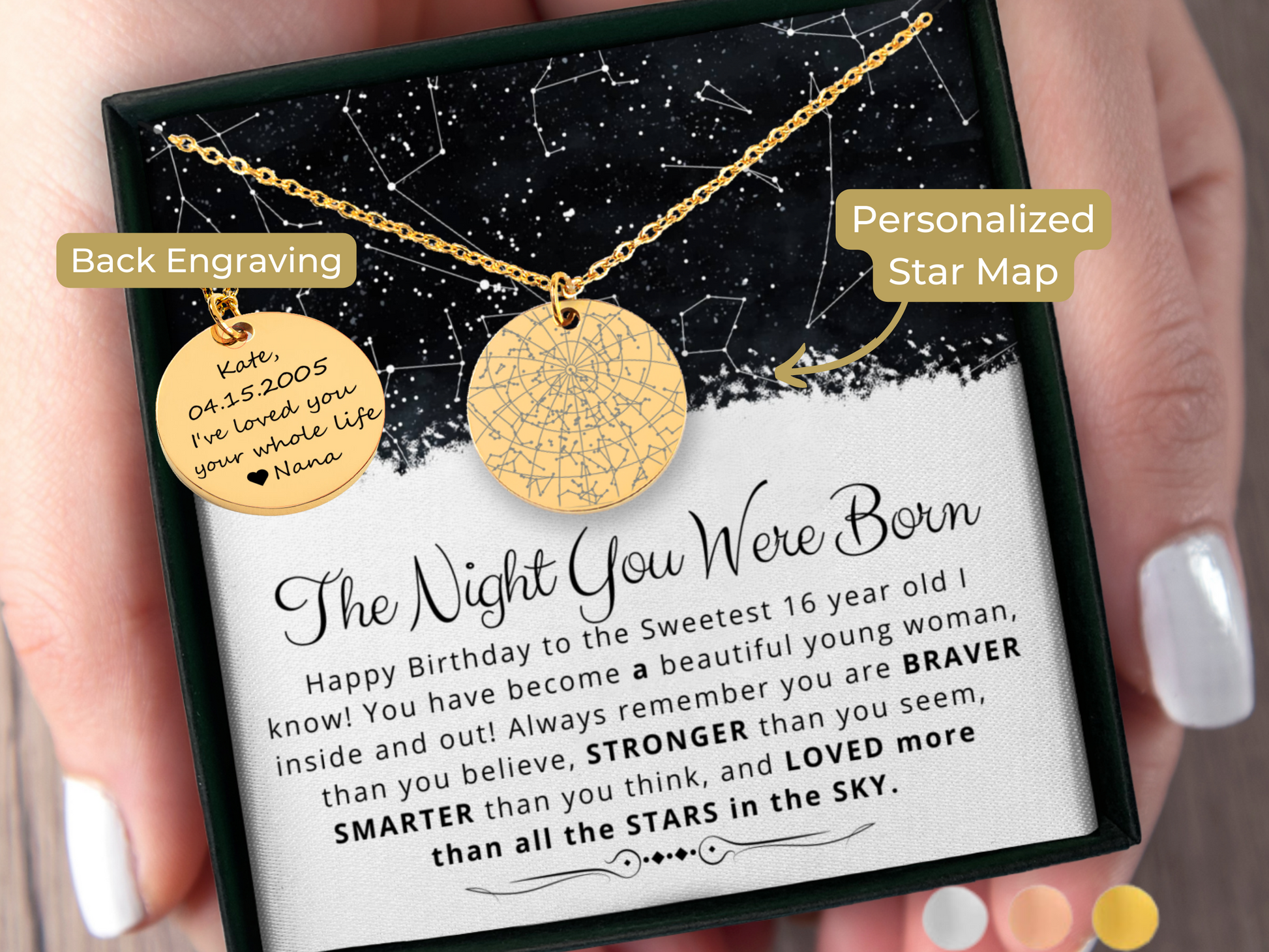 More than just a necklace…eternalize a special moment in your life with a custom star map necklace. Was it the day you met your soul-mate, the day you passed an important exam, the birth of a child or the day you realized your world has changed? Simply add a date and a place, and our designers will customize a star map that shows exactly how the sky was looking on that specific day, from that specific place. Optionally, you can choose to give the necklace an even more personal touch by adding a custom message or coordinates on the back. This necklace also makes the perfect gift for anniversaries, birthdays, couples & more.