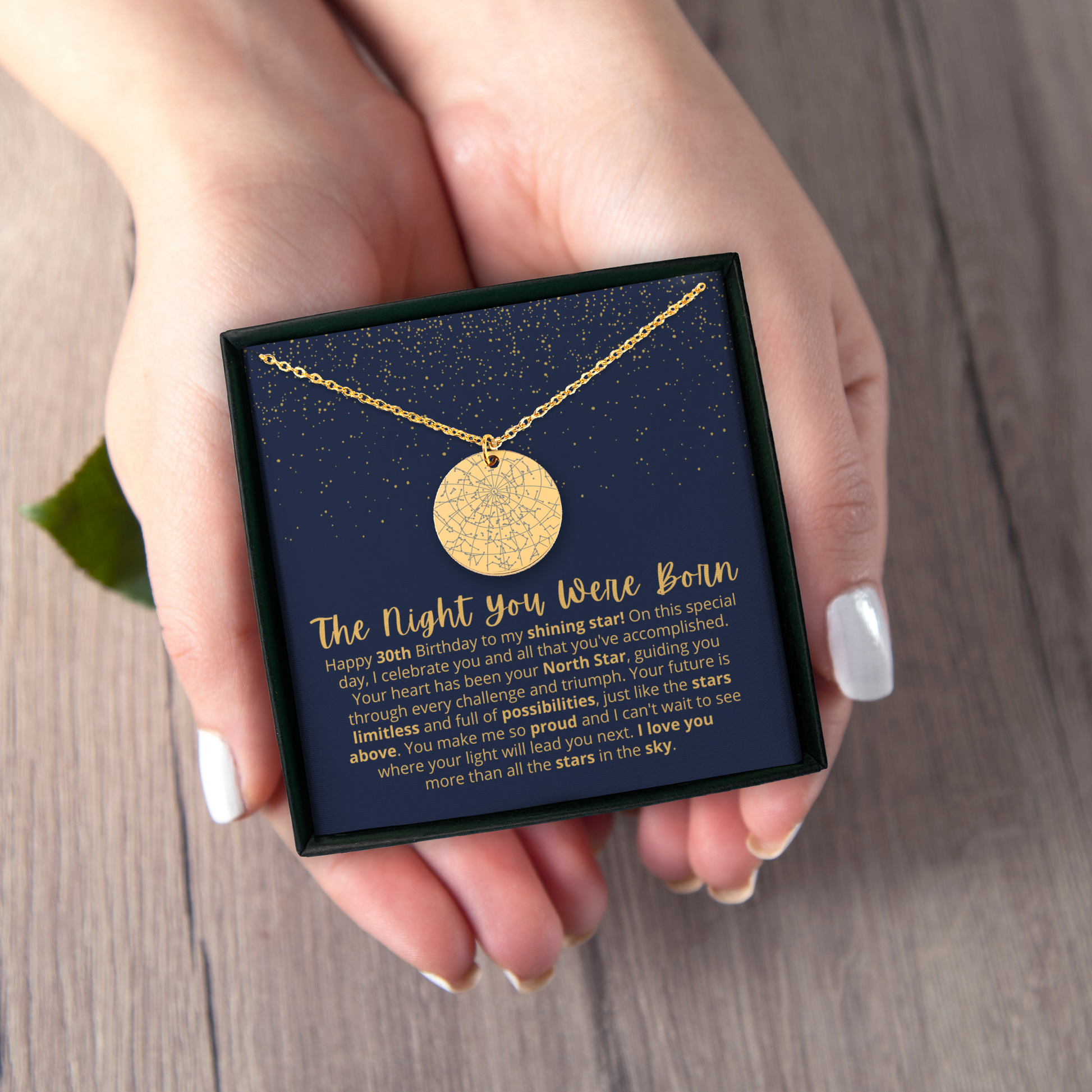 More than just a necklace…eternalize a special moment in your life with a custom star map necklace. Was it the day you met your soul-mate, the day you passed an important exam, the birth of a child or the day you realized your world has changed? Simply add a date and a place, and our designers will customize a star map that shows exactly how the sky was looking on that specific day, from that specific place. Optionally, you can choose to give the necklace an even more personal touch by adding a custom message or coordinates on the back. This necklace also makes the perfect gift for anniversaries, birthdays, couples & more.