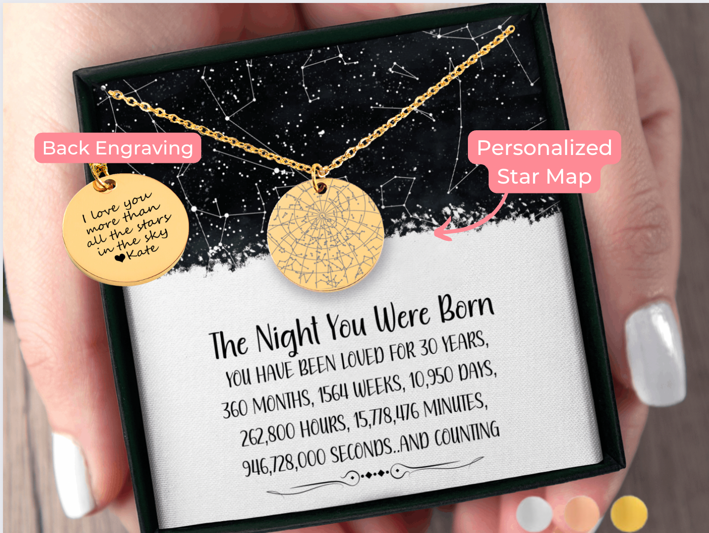Celebrate the 30 year old with this custom engraved charm necklace with a Star Map designed especially for her. It's the perfect 30th Birthday gift or Christmas gift! Simply add a date and the place she was born, and our designers will customize a star map that shows exactly how the sky was looking on that specific day, from that specific place. Optionally, you can choose to give this meaningful necklace an even more personal touch by adding a custom message, date, or coordinates on the back.