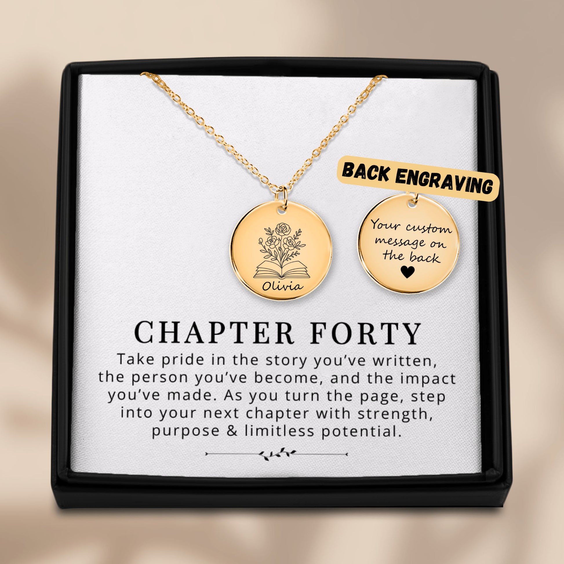 Mark a beautiful milestone with our Chapter 40 Necklace, a stunning keepsake designed to honor her journey so far and the story still unfolding. This elegant pendant is engraved with “Chapter 40” on the front and can be customized with her name for a personal touch. Add a meaningful message, date, or phrase (up to 50 characters) on the back for an extra layer of love and sentiment.