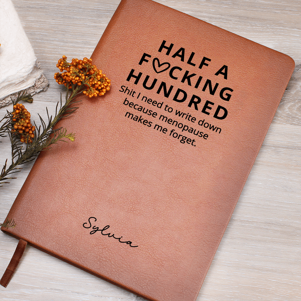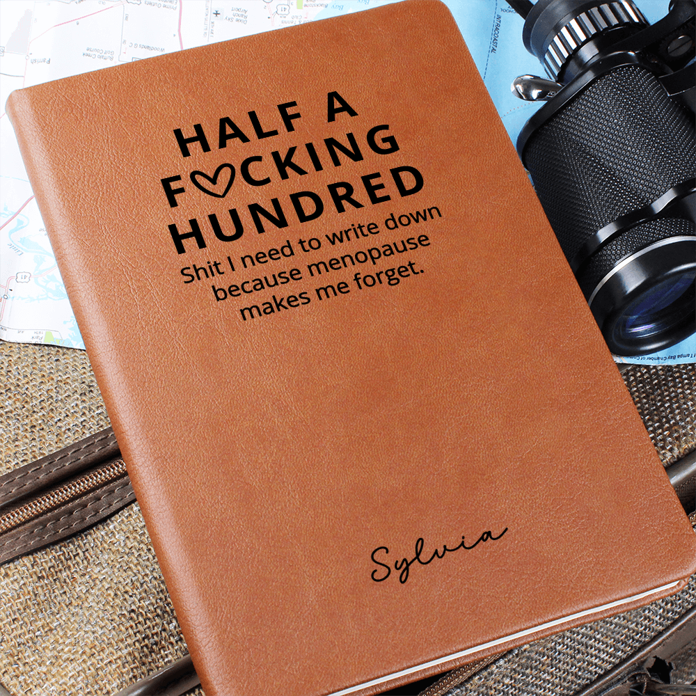 Celebrate turning 50 in style with this hilarious and practical 50th birthday journal, custom engraved with a name for that extra special touch. Featuring the cheeky phrase “Half a Fcking Hundred – Shit I need to write down because menopause makes me forget”*, this journal is the perfect gift for anyone woman embracing the big 5-0 with humor! Ideal for jotting down ideas, plans, or just keeping track of the things we all forget as we get wiser.