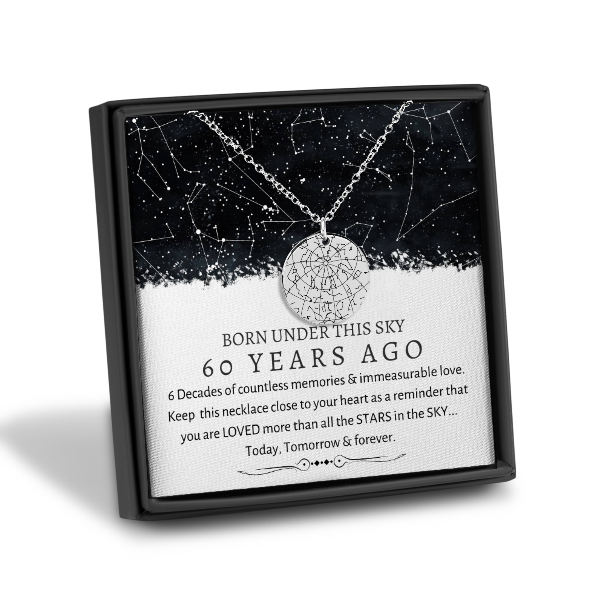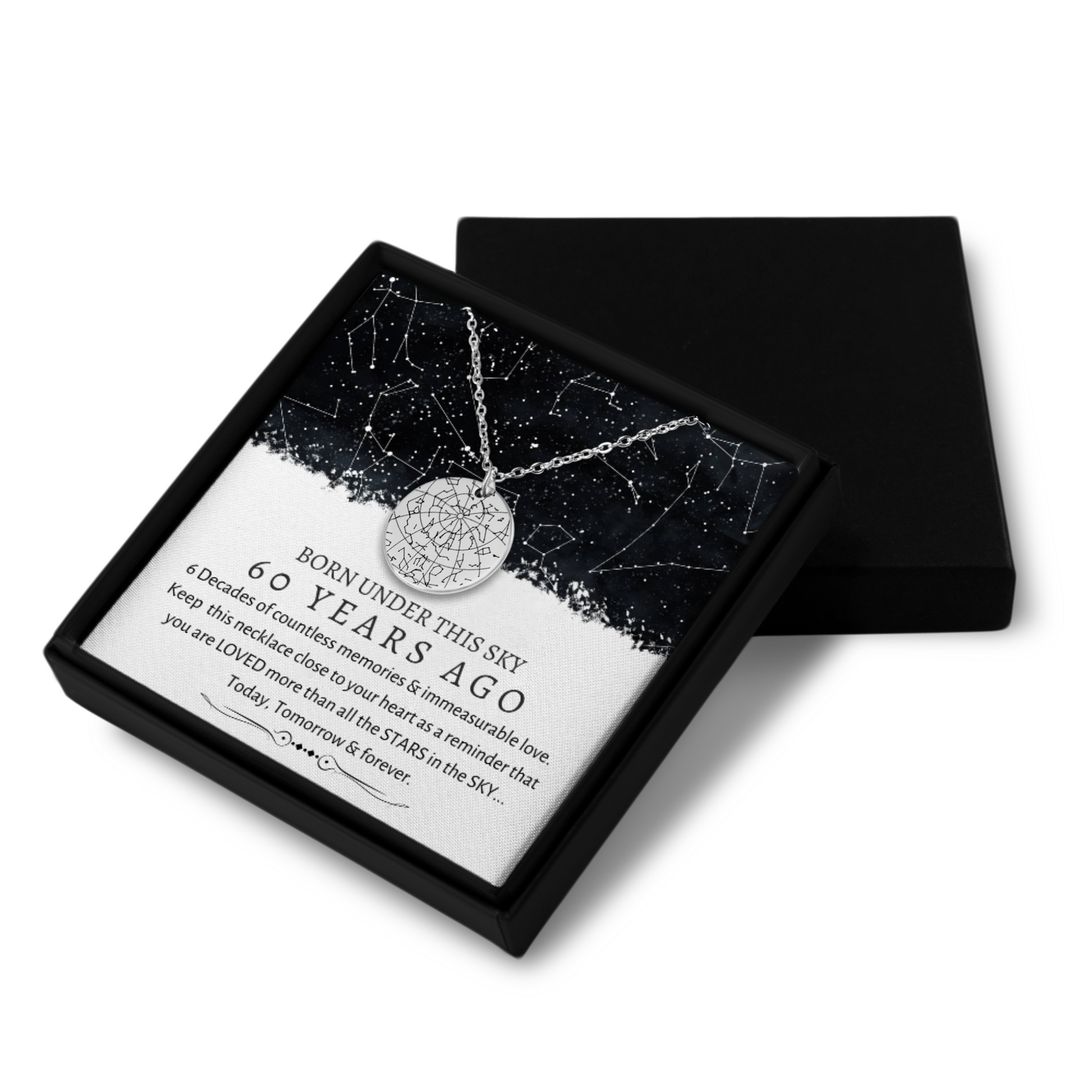 Celebrate her milestone birthday with this custom engraved charm necklace with a Star Map designed especially for her. It's the perfect 60th Birthday gift or Christmas gift! Simply add a date and the place she was born, and our designers will customize a star map that shows exactly how the sky was looking on that specific day, from that specific place. Optionally, you can choose to give this meaningful necklace an even more personal touch by adding a custom message, date, or coordinates on the back.
