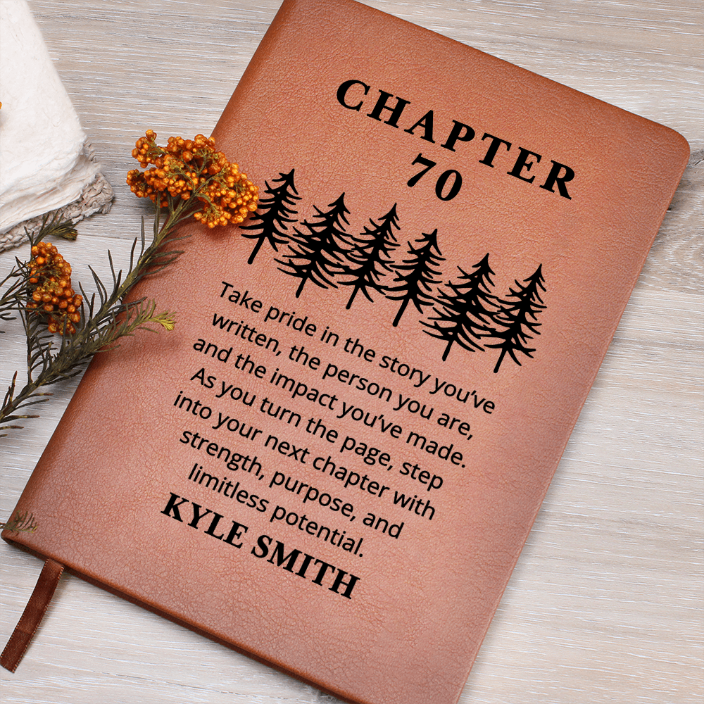 Celebrate a milestone in style with our Personalized Chapter Seventy Journal — a unique 70th birthday gift that combines meaning, elegance, and practicality. This custom notebook features the words “Chapter 70” beautifully displayed on the vegan leather cover, along with the recipient’s name and an optional personalized message.