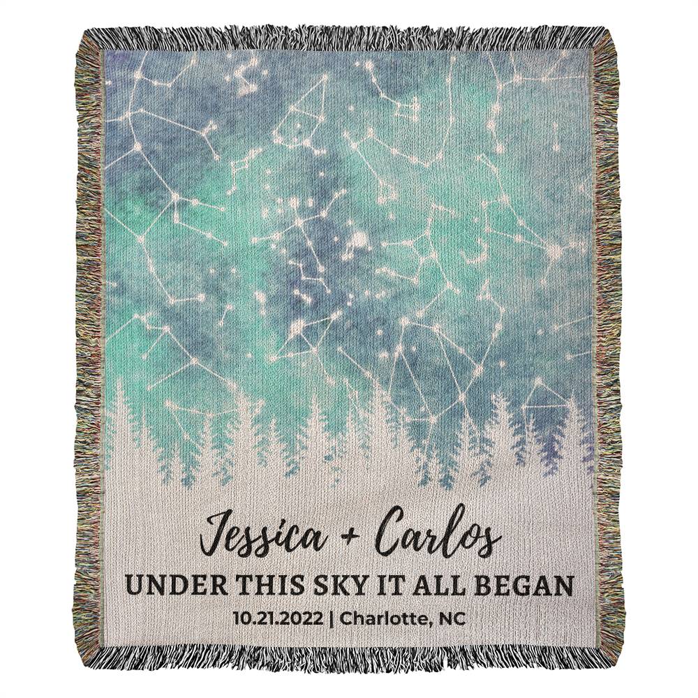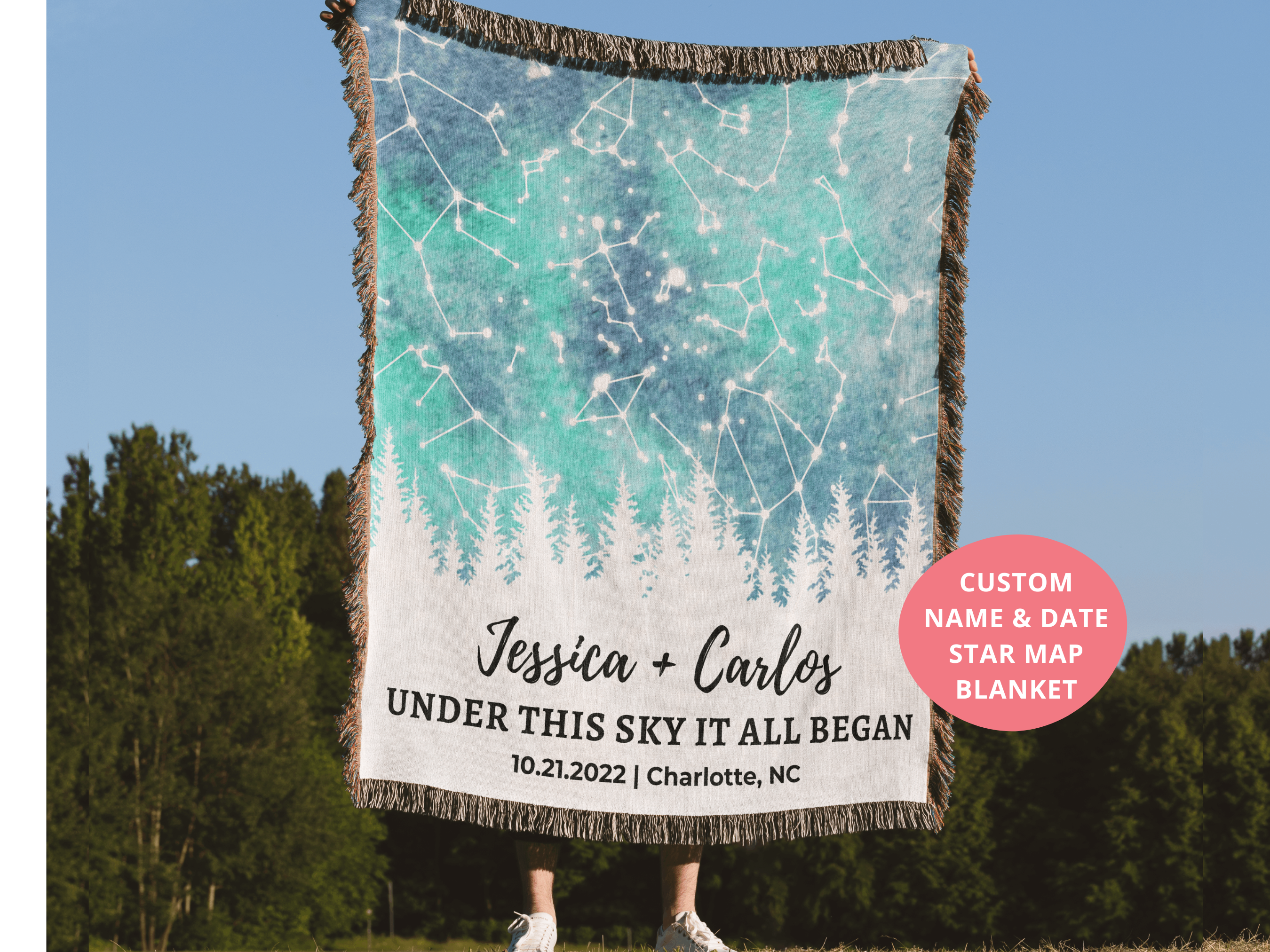 Celebrate love with this personalized Anniversary Star Map Blanket. This beautiful Heirloom Woven Blanket is the perfect Cotton Anniversary gift, Wedding gift, Birthday gift or Christmas gift! Simply add the special date and place, and our designers will customize a star map that shows exactly how the sky was looking on that specific day, from that specific place.