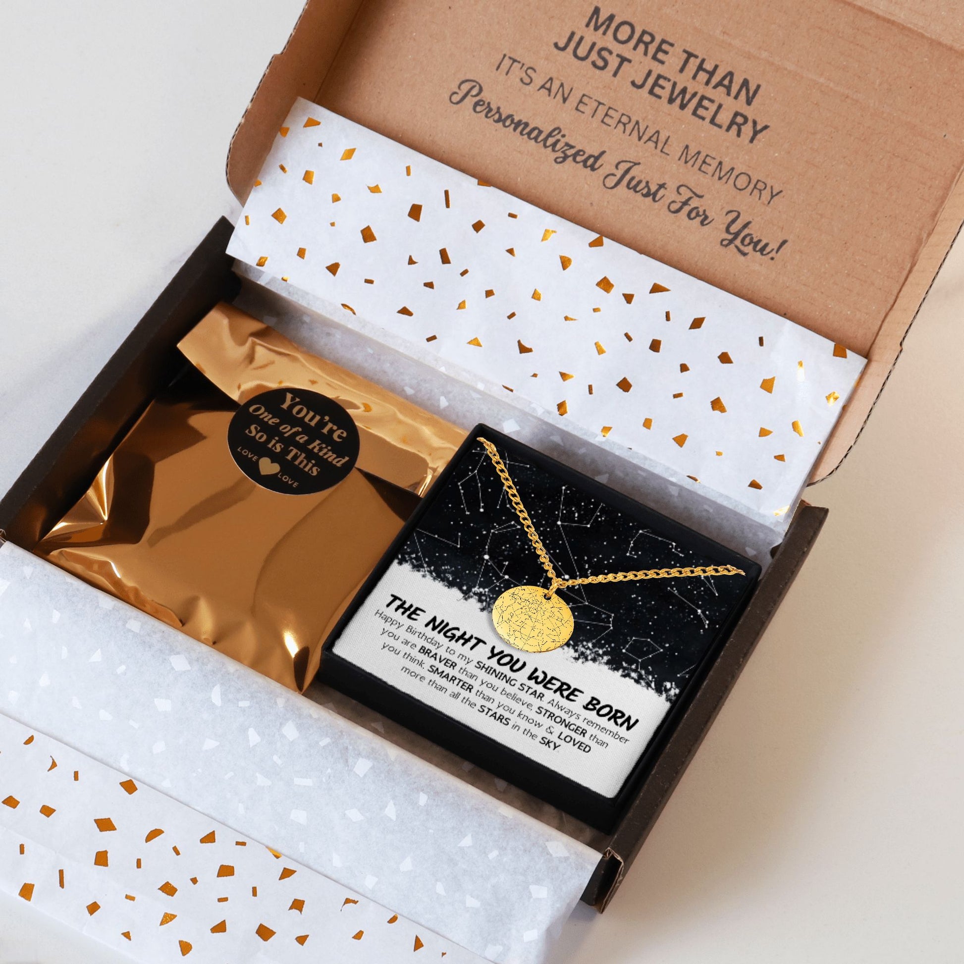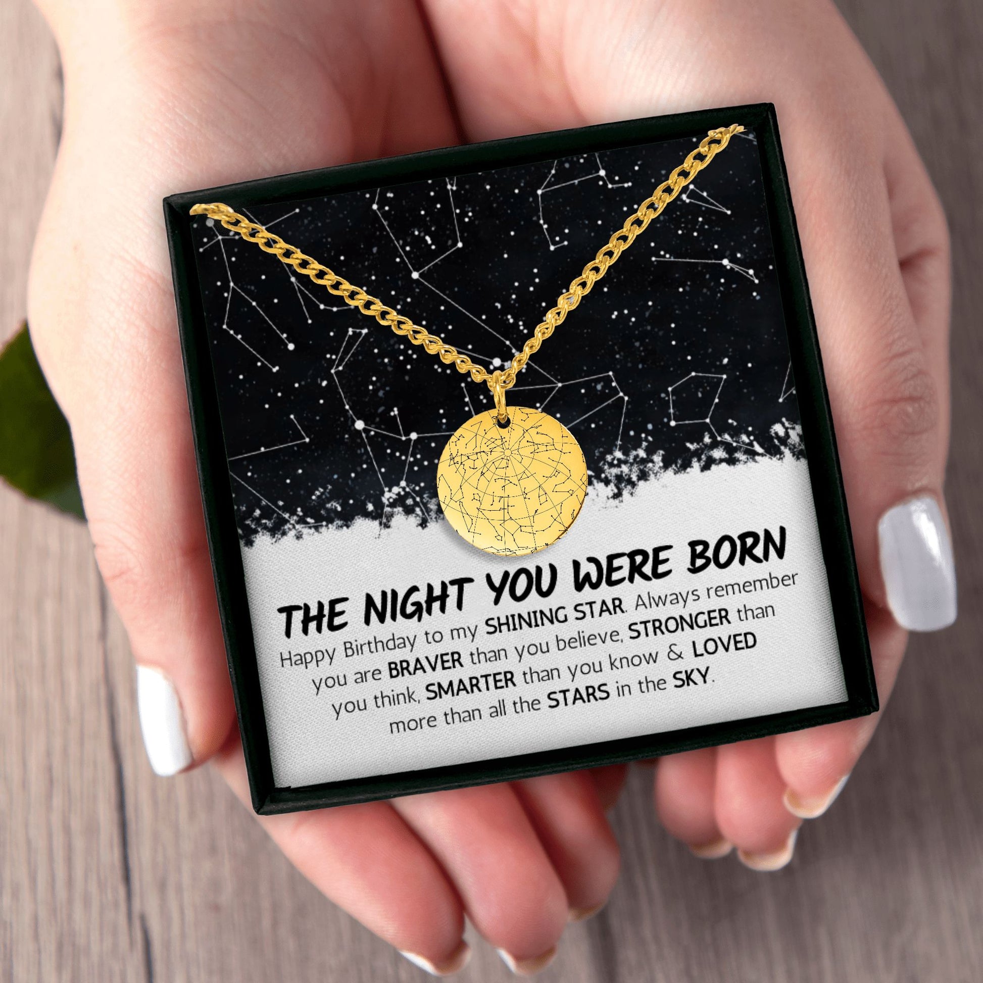 Show your son how much you love him with this personalized Star Map cuban chain necklace. This custom engraved Star Map is designed especially for him. It's the perfect Birthday gift, Wedding Day gift or Christmas gift! Simply add the date and place where they were born (or whatever special day you'd like), and our designers will customize a star map that shows exactly how the sky was looking on that specific day, from that specific place.