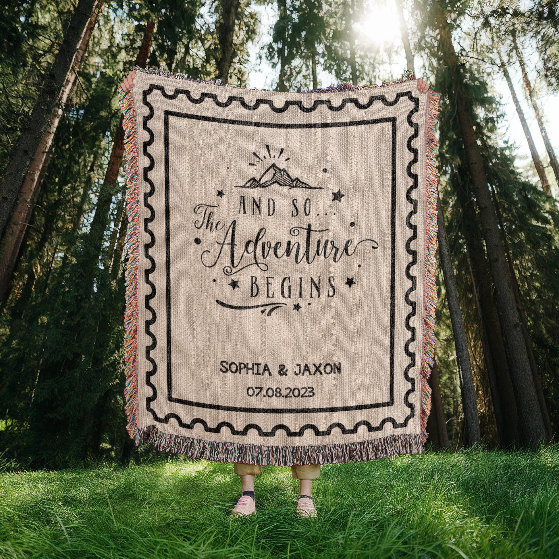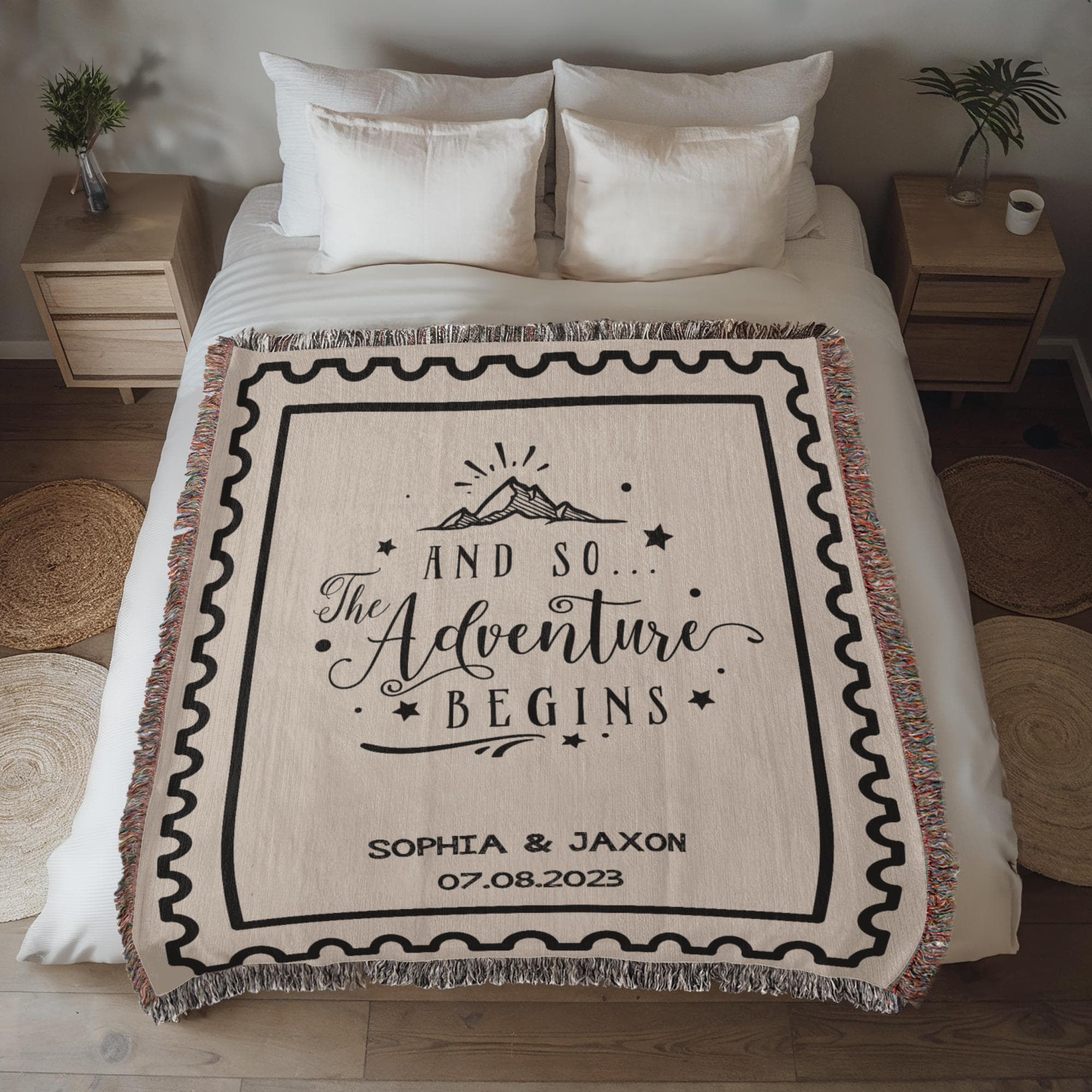Custom Name and Date Wedding Blanket, Personalized Woven Throw, Hand Drawn Wedding Stamp Gift, Whimsical Couple Keepsake, Wedding Souvenir