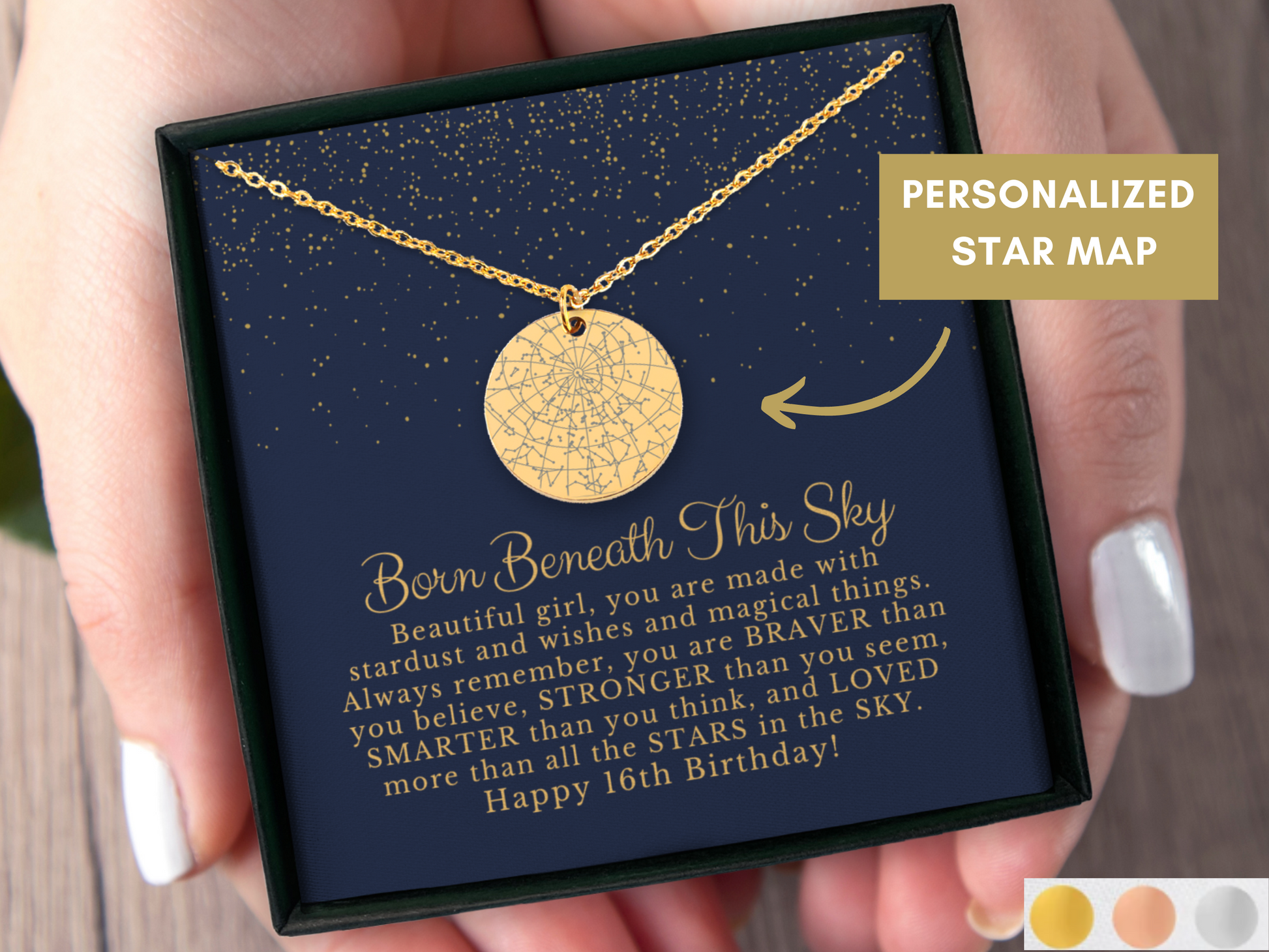 More than just a necklace…eternalize a special moment in your life with a custom star map necklace. Was it the day you met your soul-mate, the day you passed an important exam, the birth of a child or the day you realized your world has changed? Simply add a date and a place, and our designers will customize a star map that shows exactly how the sky was looking on that specific day, from that specific place. Optionally, you can choose to give the necklace an even more personal touch by adding a custom message or coordinates on the back. This necklace also makes the perfect gift for anniversaries, birthdays, couples & more.