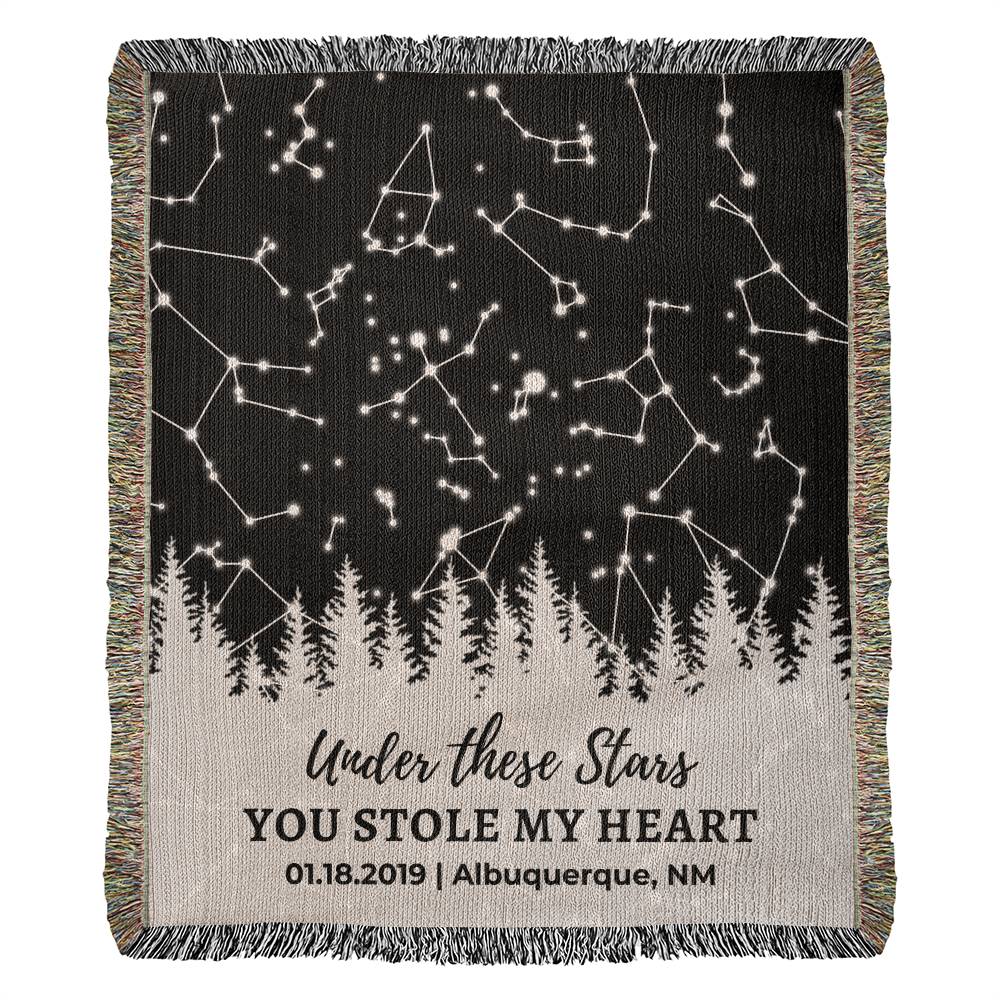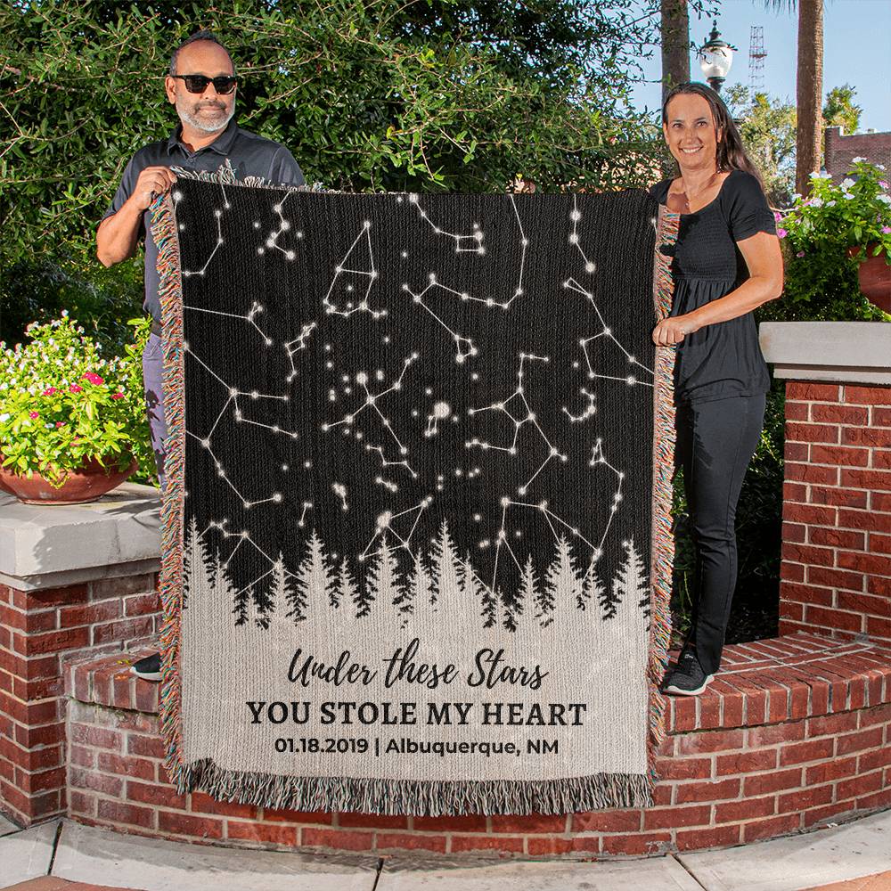 Celebrate love with this personalized Anniversary Star Map Blanket. This beautiful Heirloom Woven Blanket is the perfect Anniversary gift, Wedding gift, Birthday gift or Christmas gift! Simply add the special date and place, and our designers will customize a star map that shows exactly how the sky was looking on that specific day, from that specific place.