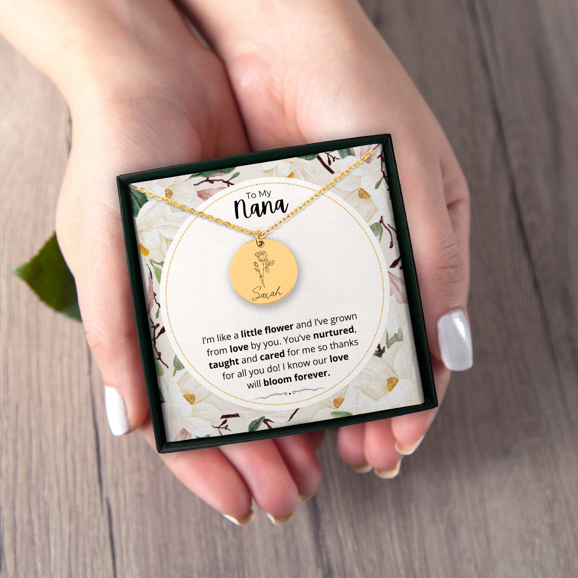 Create a truly unique gift by personalizing this necklace with a name and a birth flower. Optionally, you can choose to give the necklace an even more personal touch by adding a custom message or coordinates on the back.