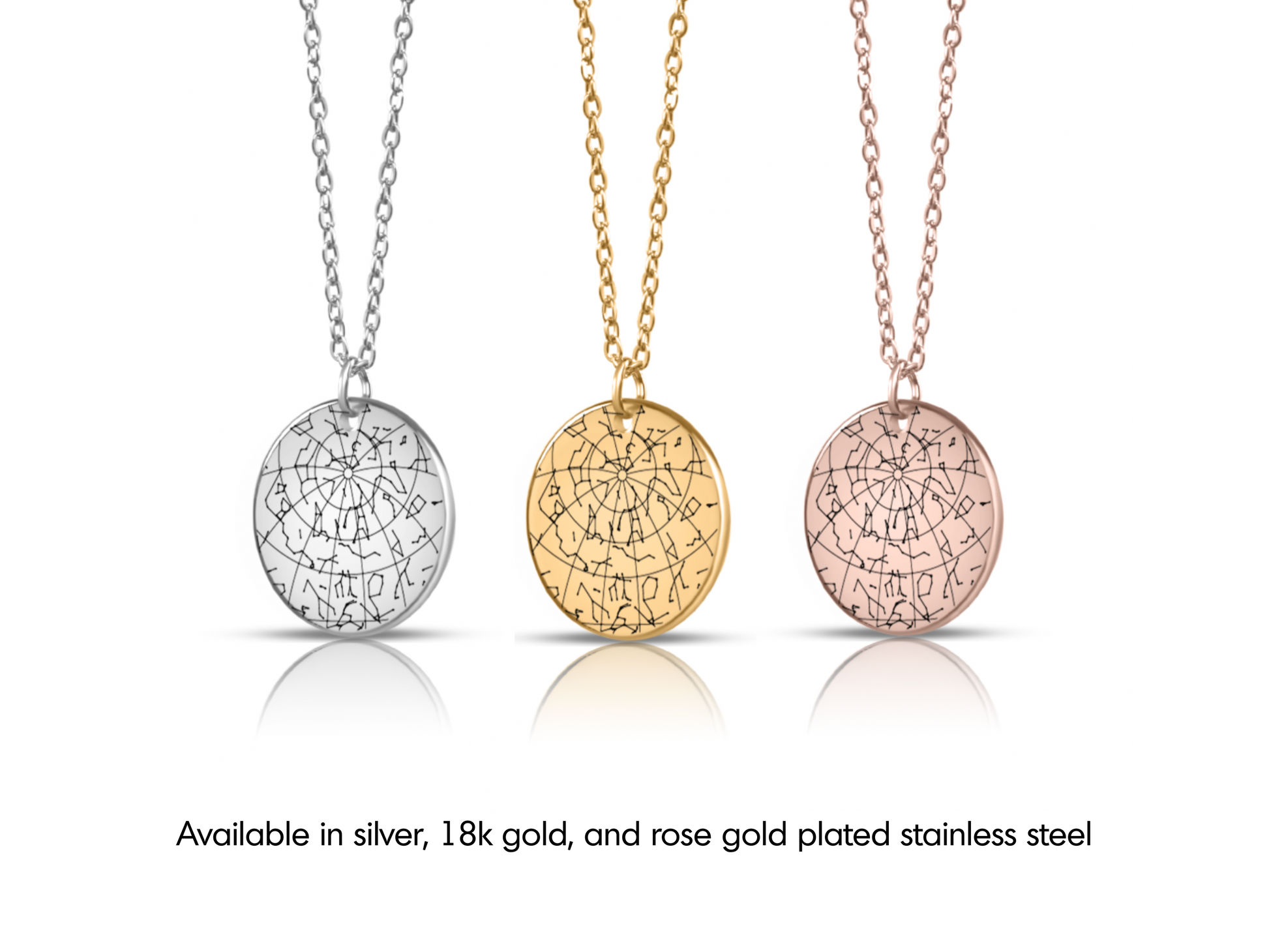 Celebrate her birthday with this custom engraved charm necklace with a Star Map designed especially for her. It's the perfect unique Birthday gift or Christmas gift! Simply add a date and the place she was born, and our designers will customize a star map that shows exactly how the sky was looking on that specific day, from that specific place. Optionally, you can choose to give this meaningful necklace an even more personal touch by adding a custom message, date, or coordinates on the back.