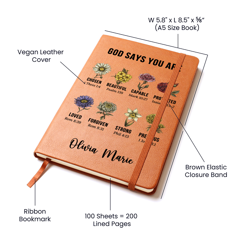 A faith-filled personalized gift made to inspire. This “God Says You Are” journal features uplifting affirmations with Bible verses and vibrant watercolor florals, beautifully printed on a premium vegan leather cover. Add a custom name to make it a treasured keepsake for prayer, devotionals, or journaling.