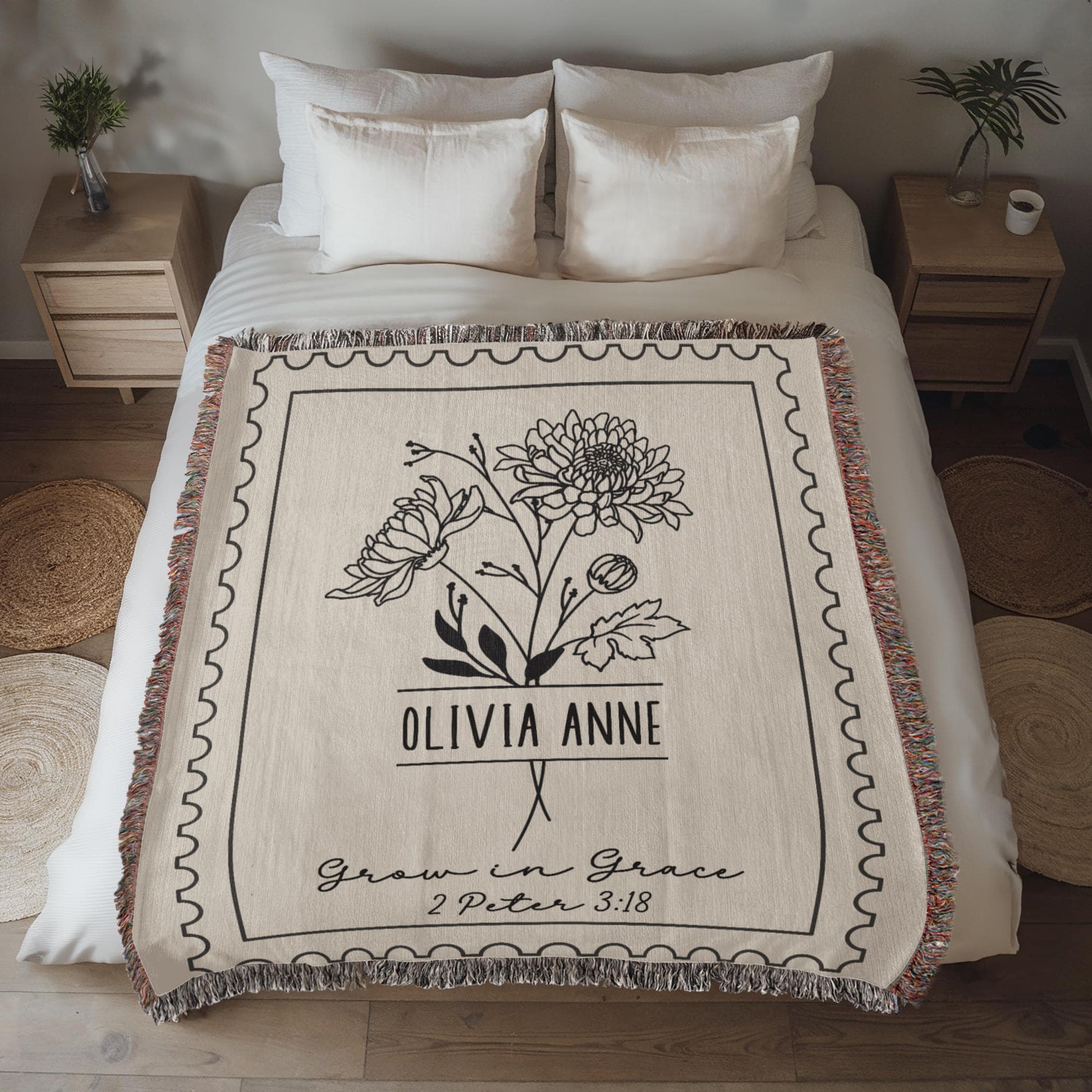 Grow in Grace Personalized Birth Month Flower Cotton Blanket, 2 Peter 3:18 Bible Verse Gift for Her, Christian Gifts for Women, Faith, Jesus
