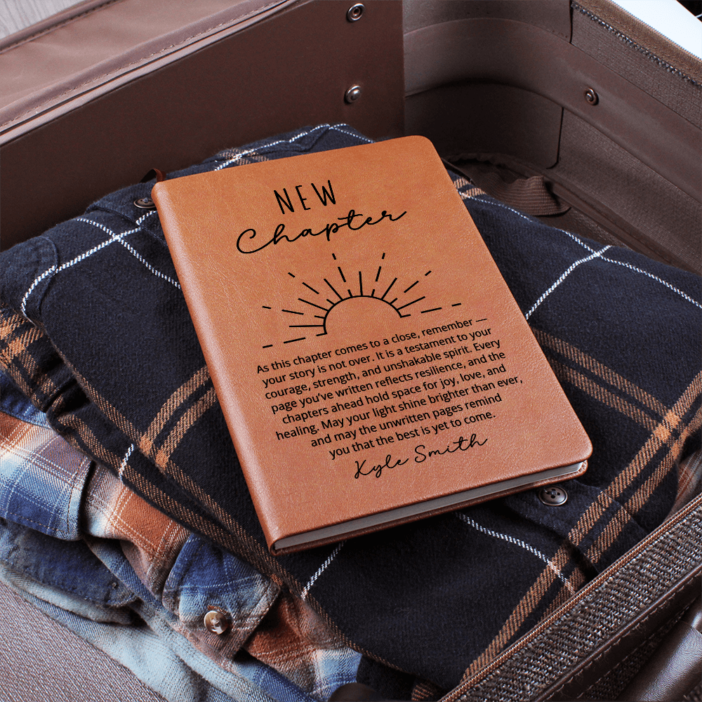 Celebrate life’s milestones with this personalized New Chapter vegan leather journal — a thoughtful gift for new beginnings, big achievements, and fresh starts. Whether it’s for surgery recovery, the end of chemo, sobriety anniversary, or birthday, this keepsake notebook carries an inspiring message of light, joy, and strength.