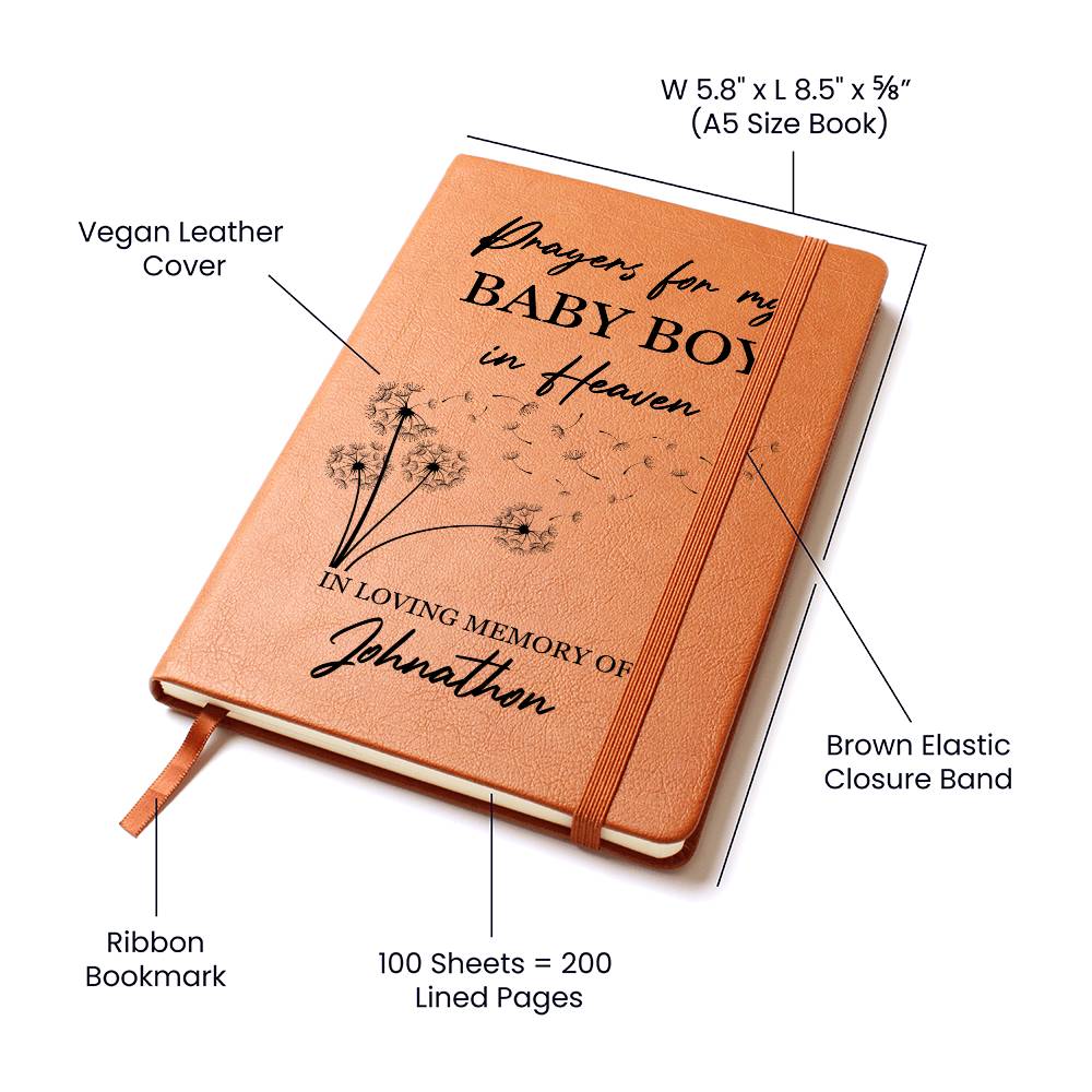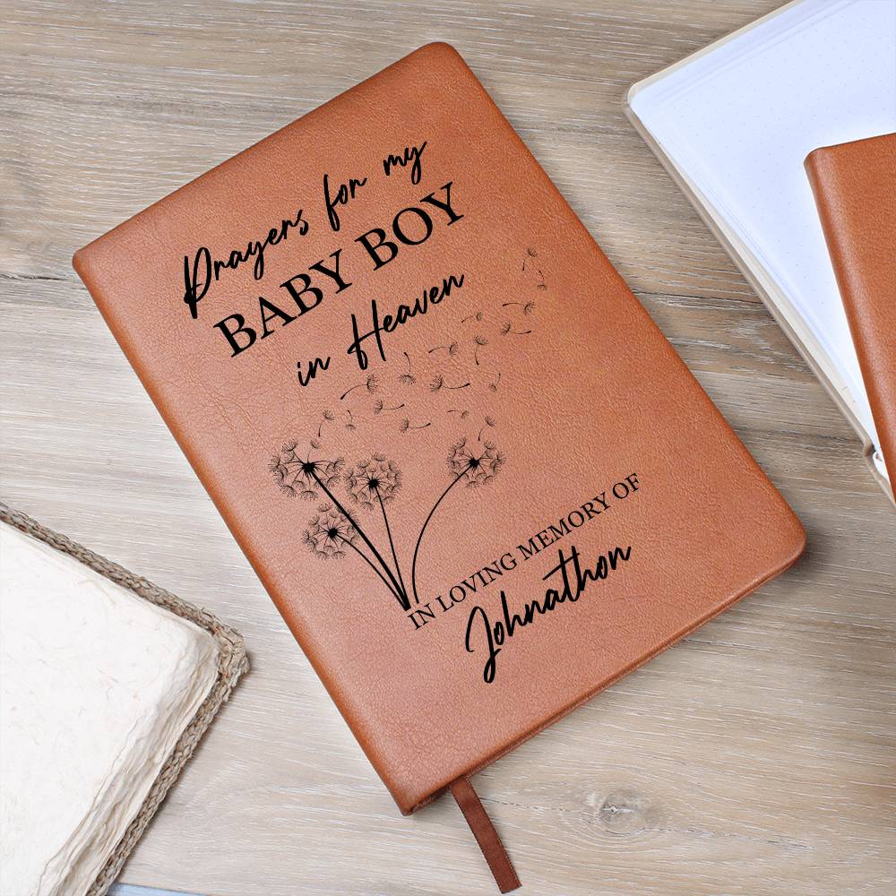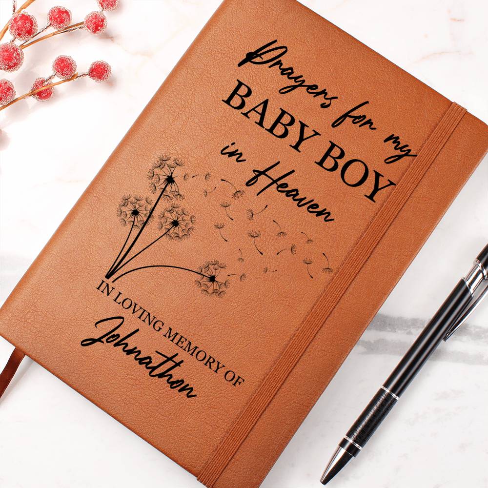 This beautiful memorial journal, titled "Prayers for My Baby Boy/Girl in Heaven," is designed to bring comfort and solace to parents who have experienced the heart-wrenching loss of a baby due to miscarriage, stillbirth, or infant loss. A gentle and sacred space to hold your prayers, thoughts, and memories, this journal is personalized with your baby’s name, making it a heartfelt keepsake for parents navigating grief.