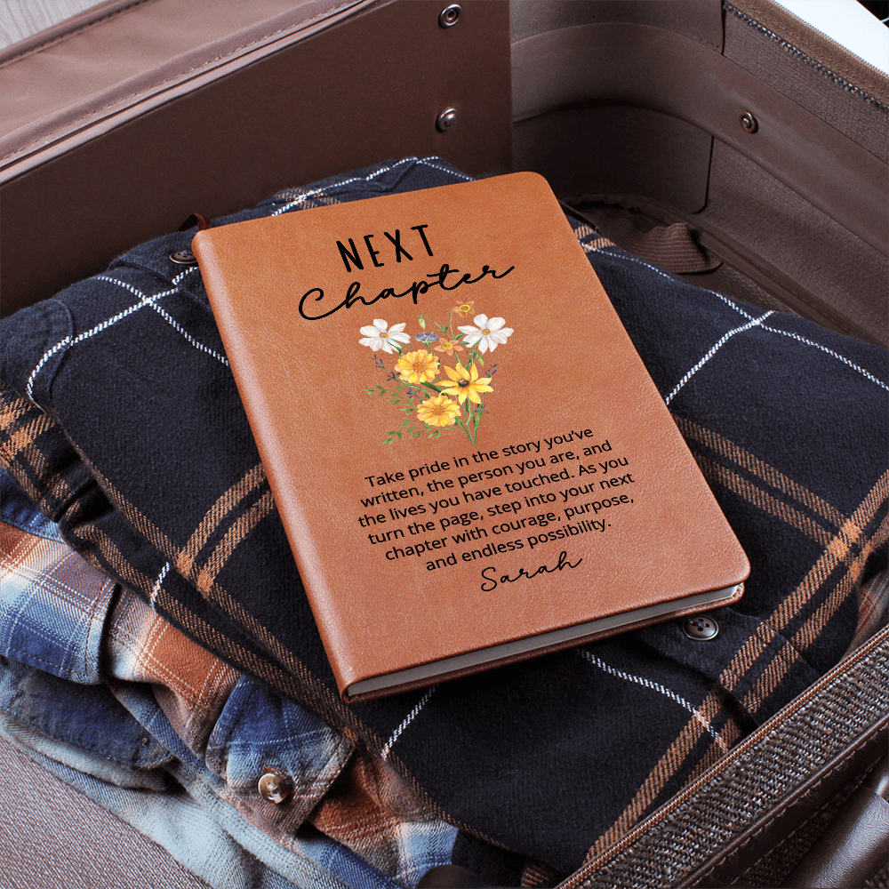 Celebrate fresh starts and unforgettable goodbyes with this beautifully crafted Next Chapter vegan leather journal. Whether it’s a retirement, graduation, new job, or housewarming gift, this personalized keepsake offers encouragement, purpose, and endless possibility.
