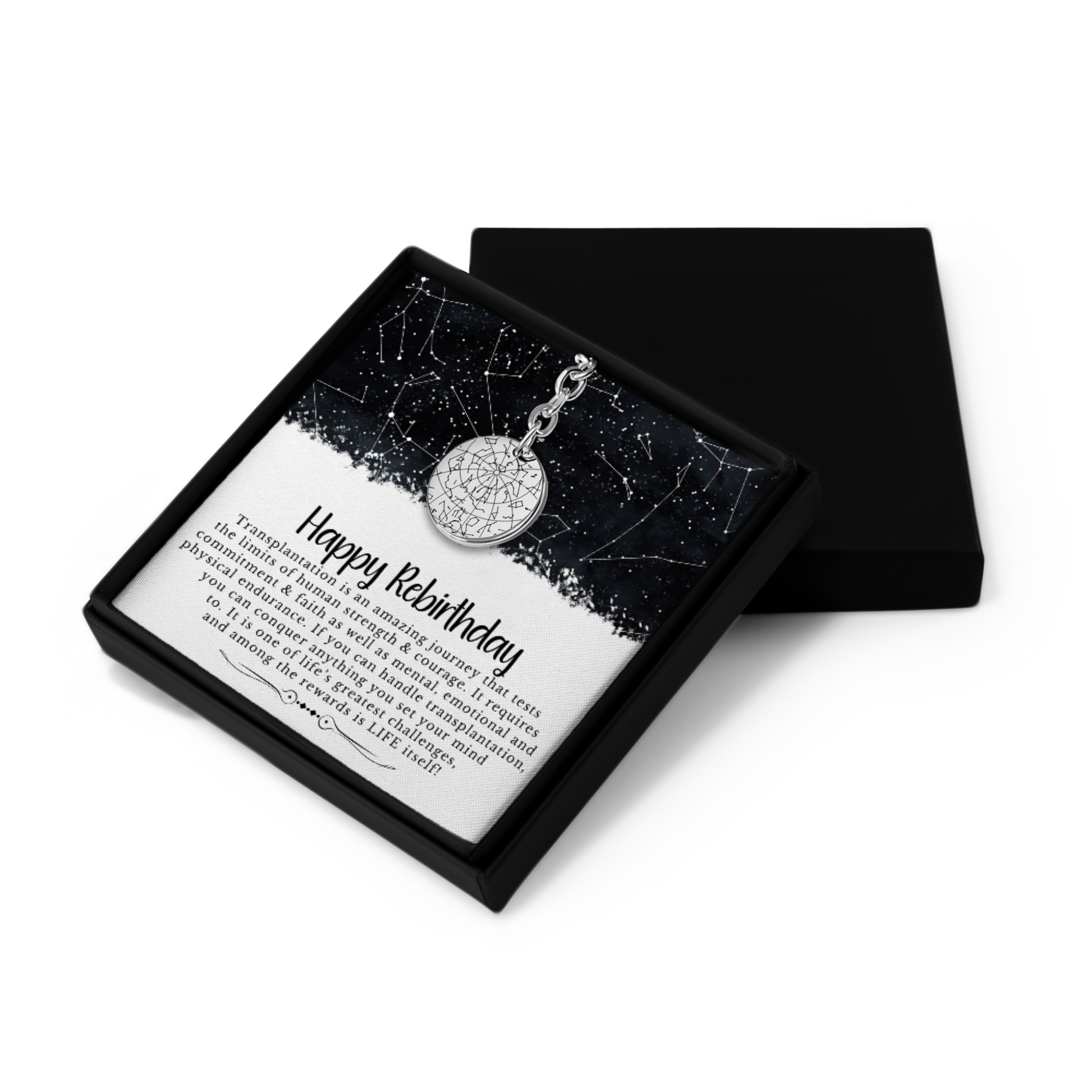 Show them how much you care with this personalized Star Map keychain. This custom engraved Star Map is designed especially for them. It's the perfect transplant gift! Simply add the special date and place, and our designers will customize a star map that shows exactly how the sky was looking on that specific day, from that specific place. Optionally, you can choose to give this meaningful keychain an even more personal touch by adding a custom message, date, or coordinates on the back.
