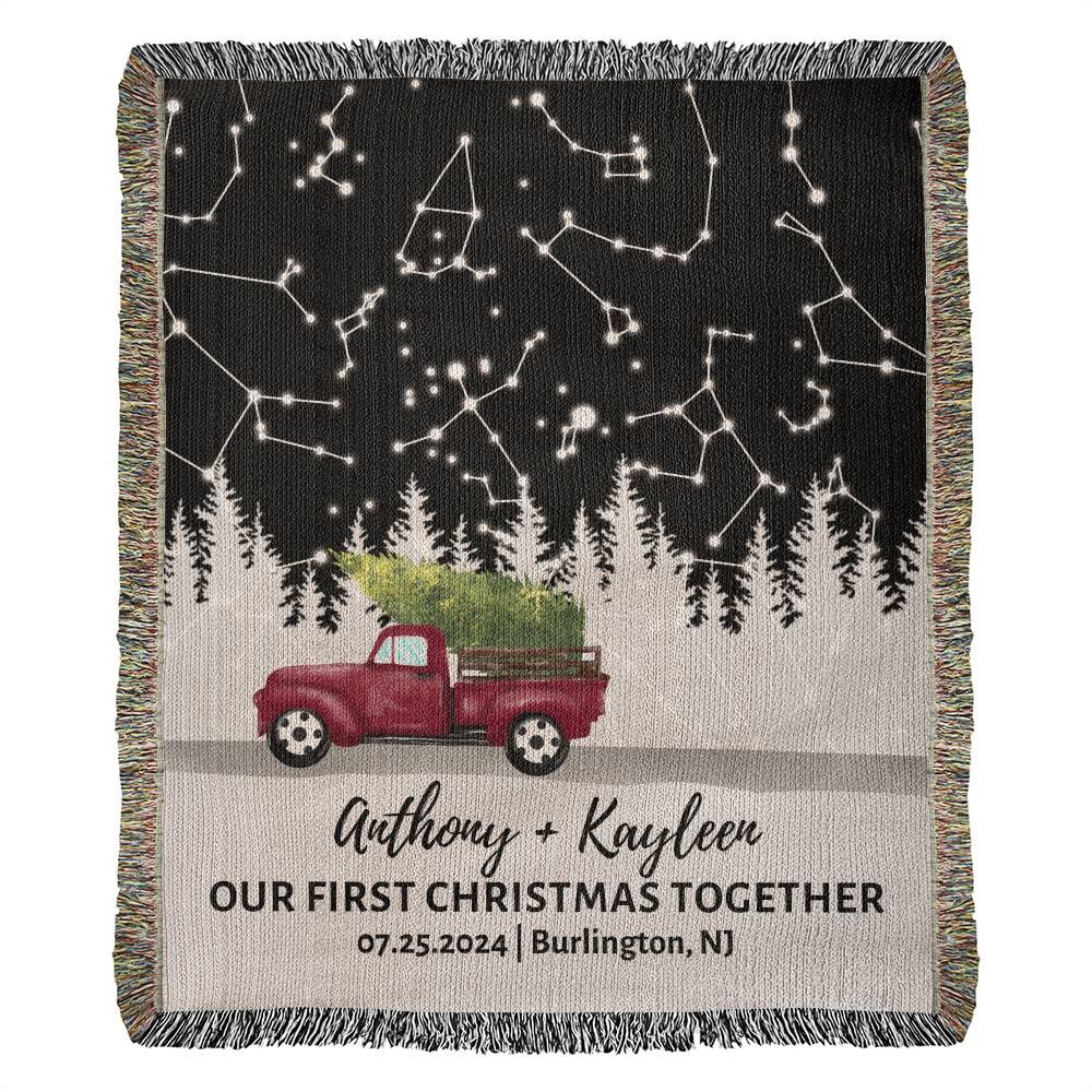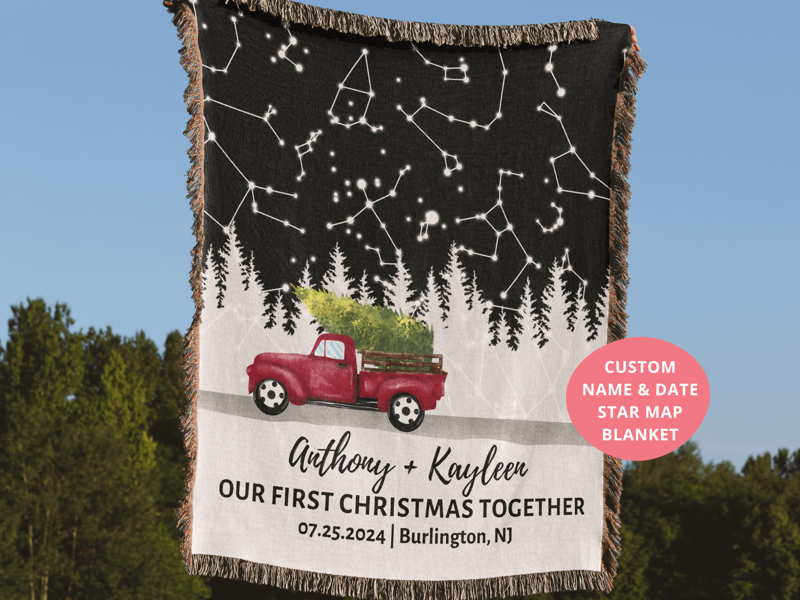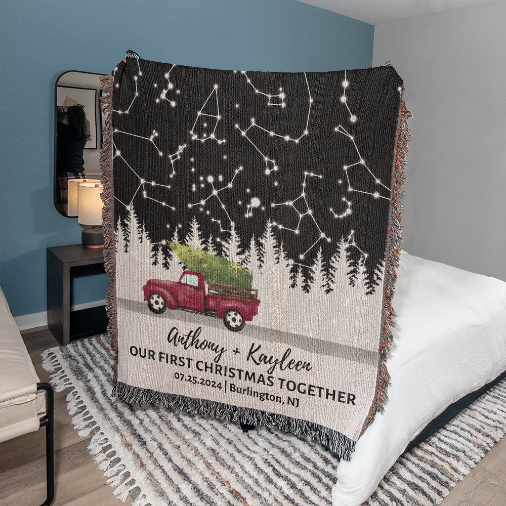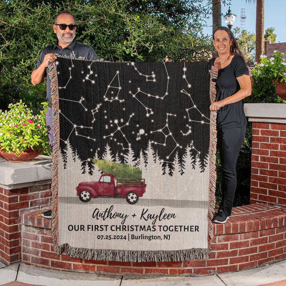 Create a unique 1st Christmas Married keepsake with our Custom Star Map By Date Heirloom Artwork Woven Blanket. This beautiful Heirloom Woven Blanket is the perfect Cotton Anniversary gift, Wedding gift, Birthday gift or First Christmas gift! Simply add the special date and place, and our designers will customize a star map that shows exactly how the sky was looking on that specific day, from that specific place.