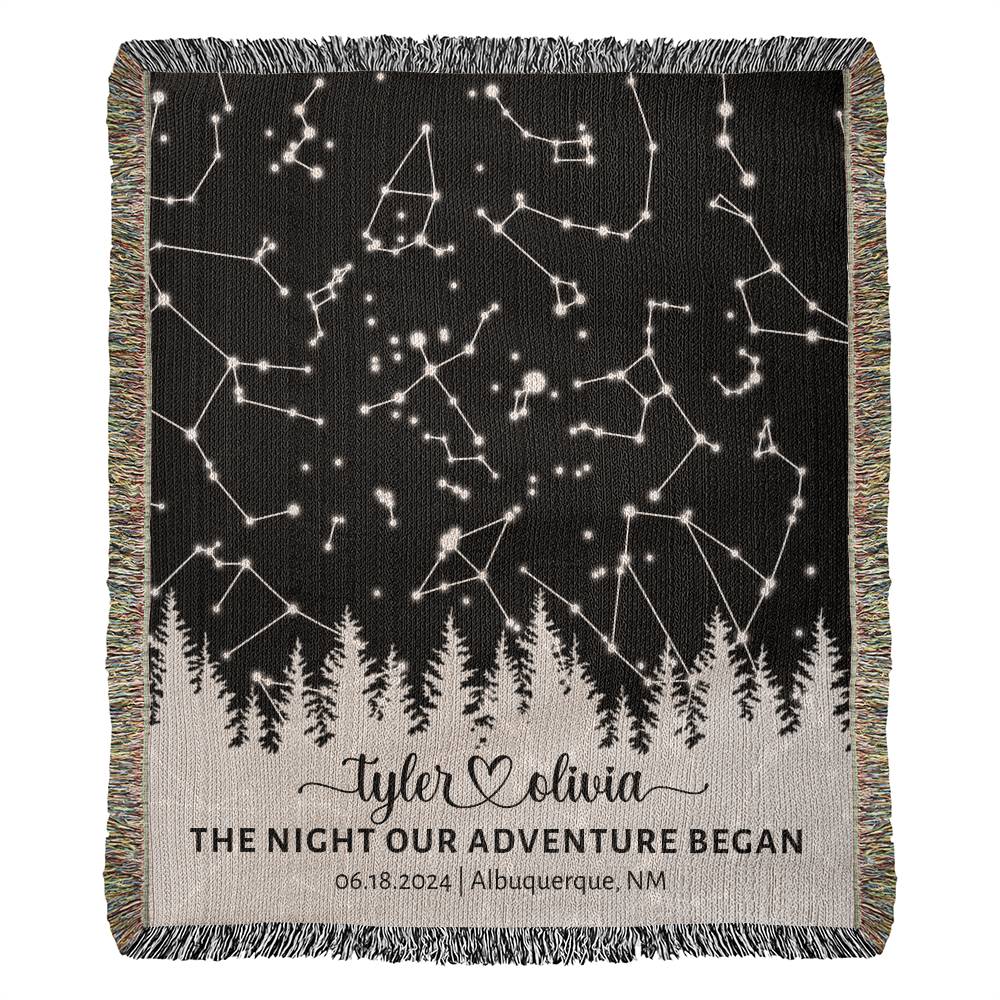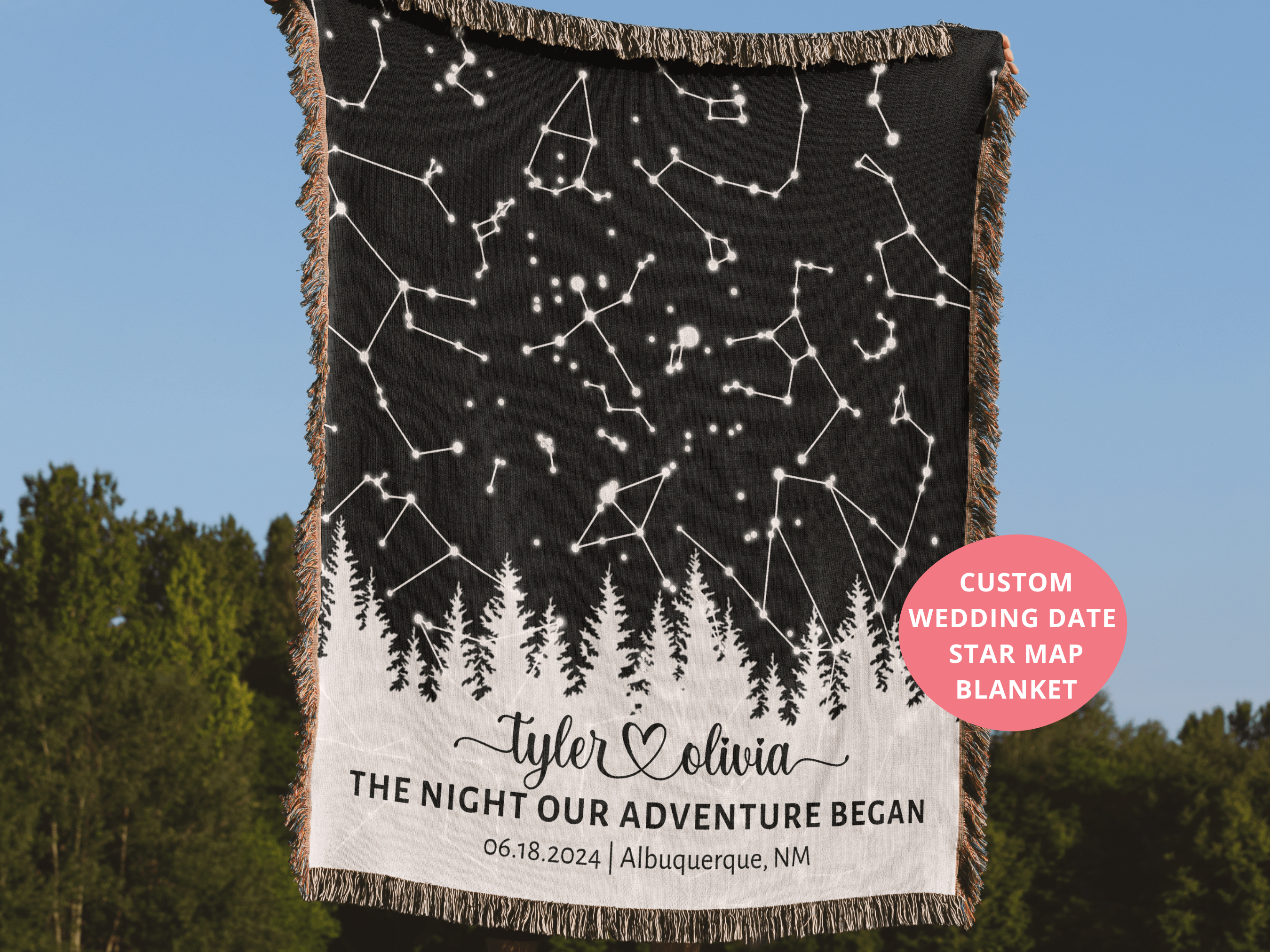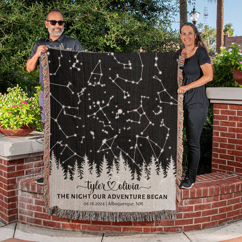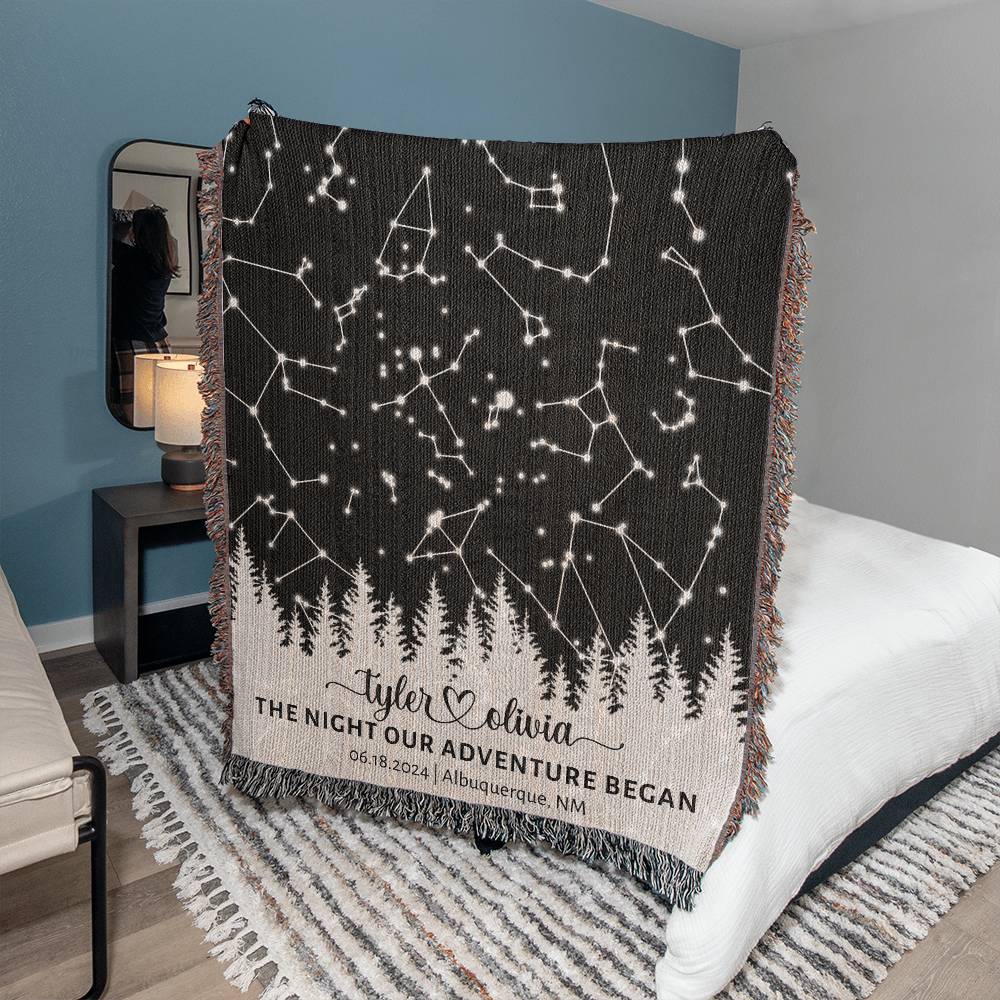 Create a unique wedding day keepsake or Cotton anniversary gift with our Heirloom Artwork Woven Blanket. This custom star map by date blanket is lovingly woven on a loom with cozy 100% cotton yarn. It makes an ideal gift for your beloved partner, family members, or dear friends on special occasions like birthdays, anniversaries, or any event where you want to express your love and appreciation in an unforgettable way.