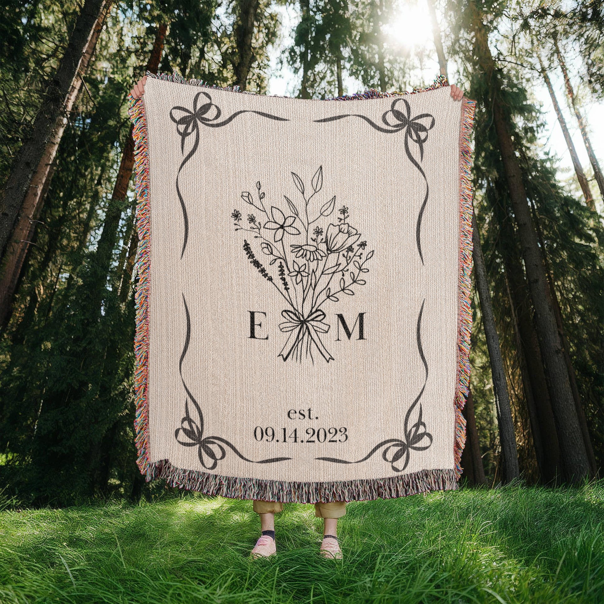 Personalized Cotton Anniversary Blanket | Coquette Custom Wedding Throw with Initials & Established Date | 2nd Anniversary Gift for Wife or Couple