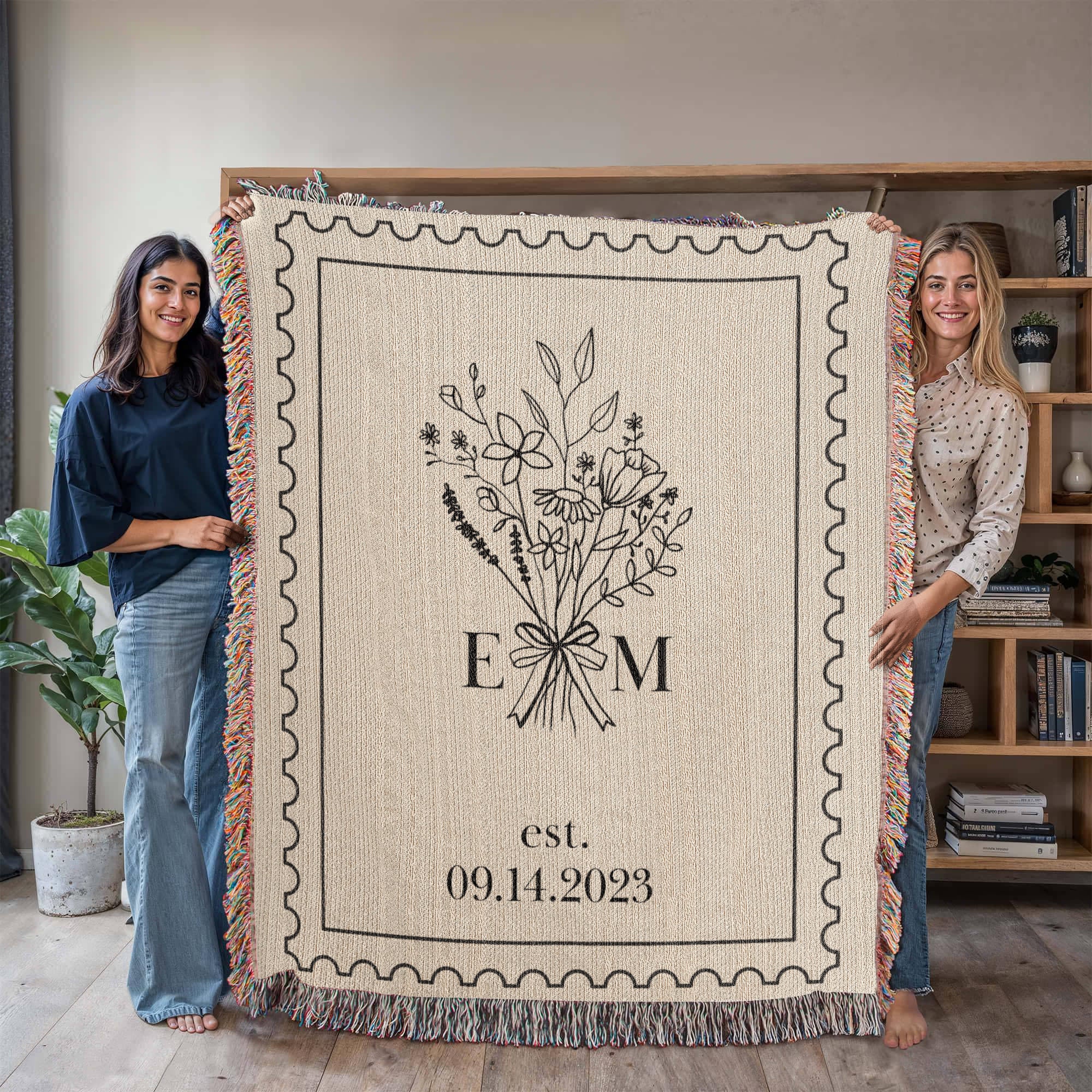 Celebrate love, milestones, and memories with our Personalized Cotton Anniversary Blanket — a timeless keepsake woven from 100% cotton yarn. Thoughtfully designed with initials, floral artwork, and your special established date, this heirloom throw blanket is the perfect way to mark a second anniversary, a wedding gift, or a meaningful present for couples, wives, husbands, girlfriends, or boyfriends.