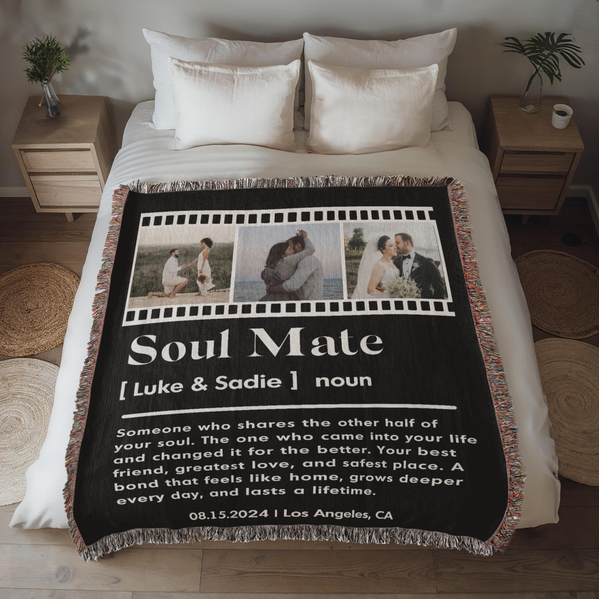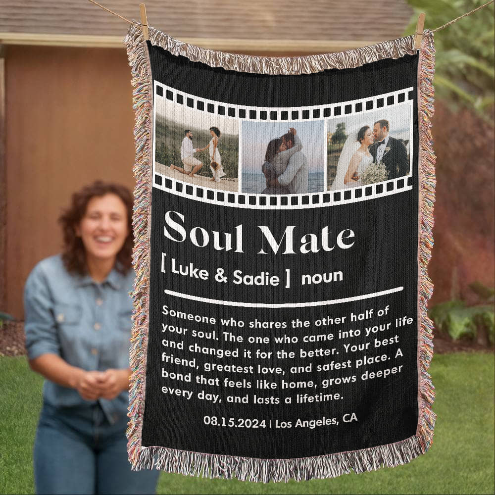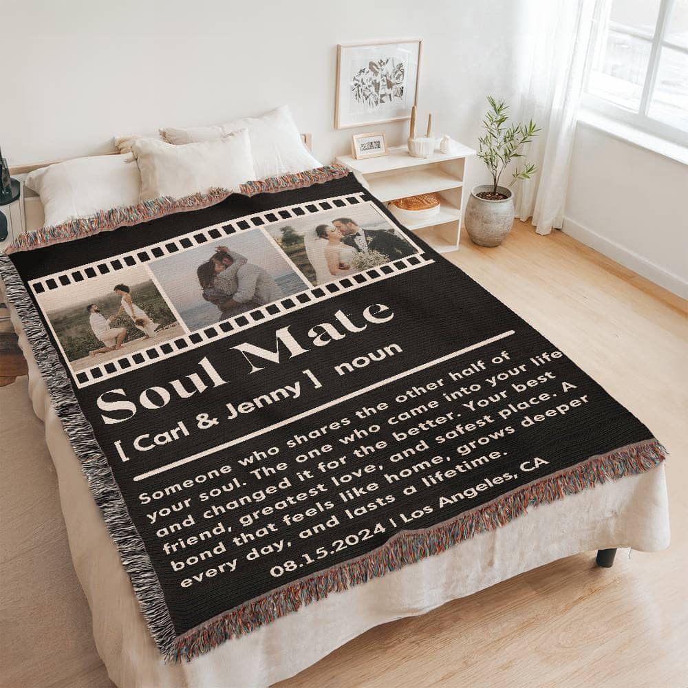 Celebrate your love with a custom woven photo blanket—a heartfelt keepsake that turns your favorite memories into a cozy, lasting tribute. Perfect for Valentine’s Day, weddings, anniversaries, or just because, this personalized couple collage beautifully blends your cherished photos with a meaningful soulmate definition tailored just for you.