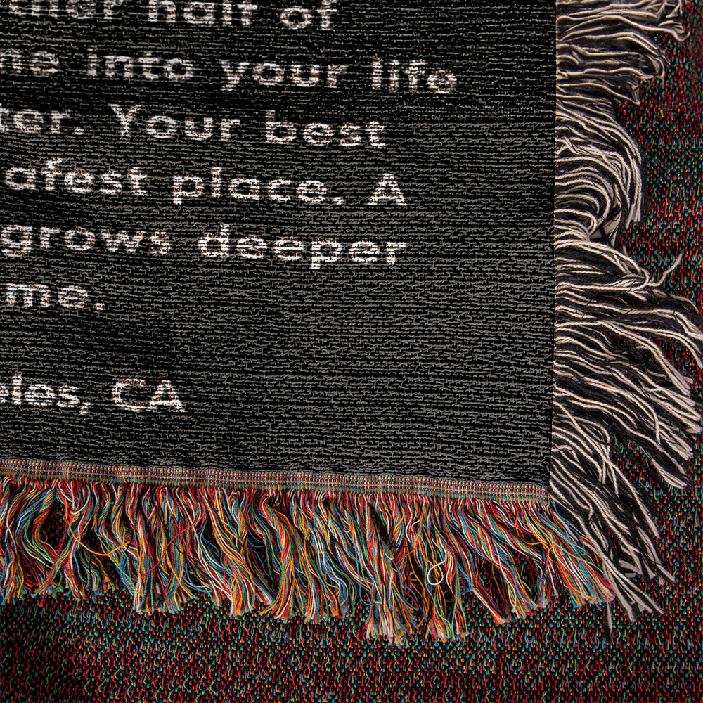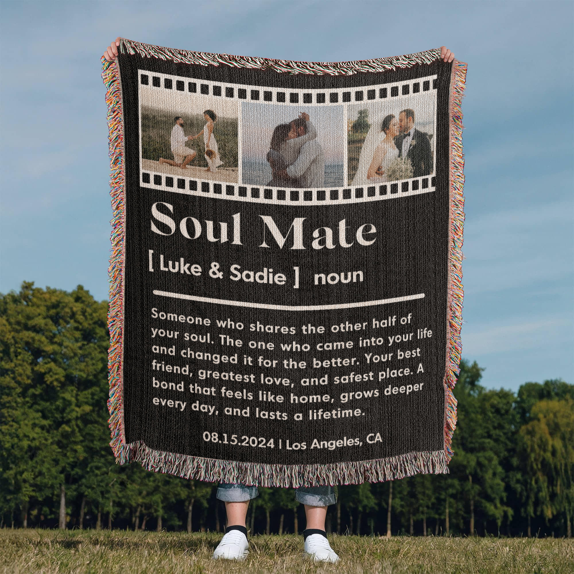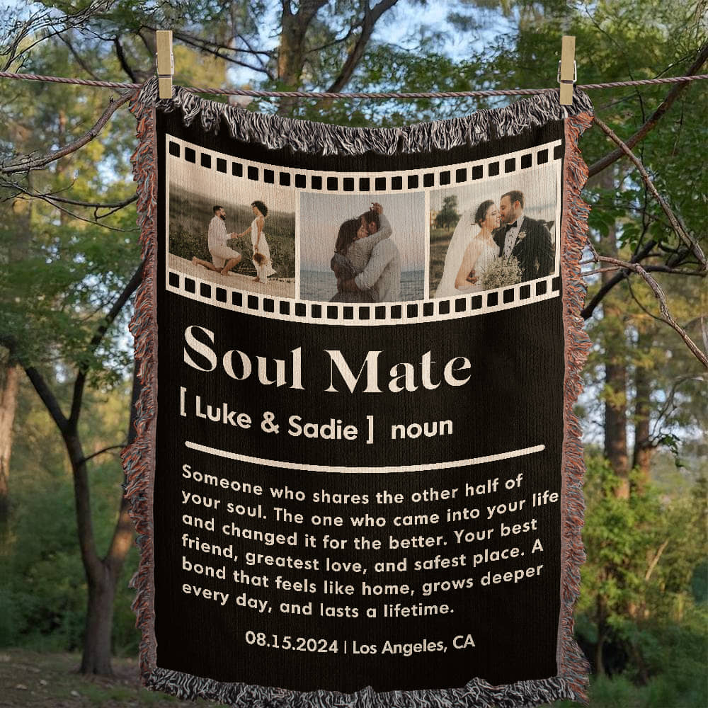 Celebrate your love with a custom woven photo blanket—a heartfelt keepsake that turns your favorite memories into a cozy, lasting tribute. Perfect for Valentine’s Day, weddings, anniversaries, or just because, this personalized couple collage beautifully blends your cherished photos with a meaningful soulmate definition tailored just for you.