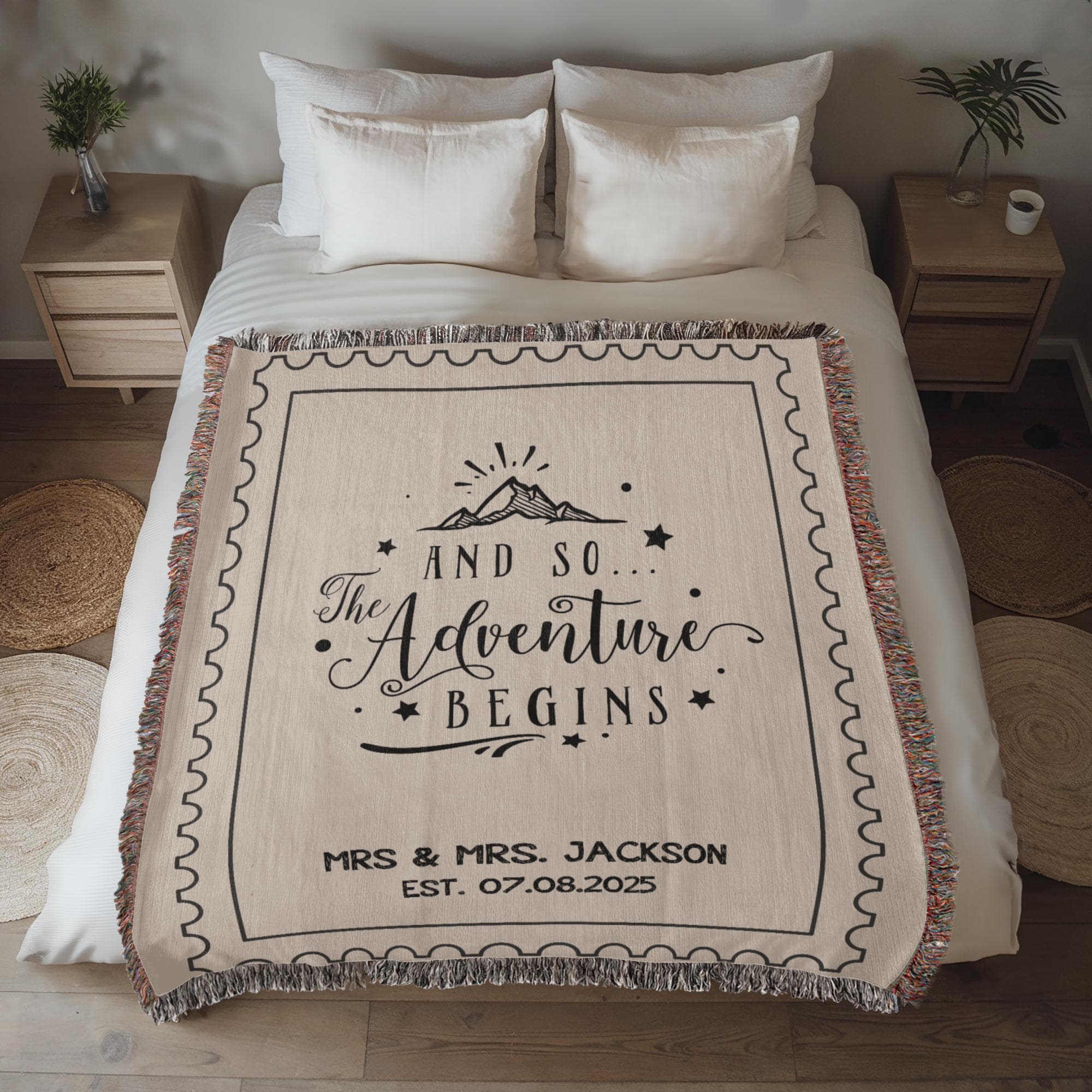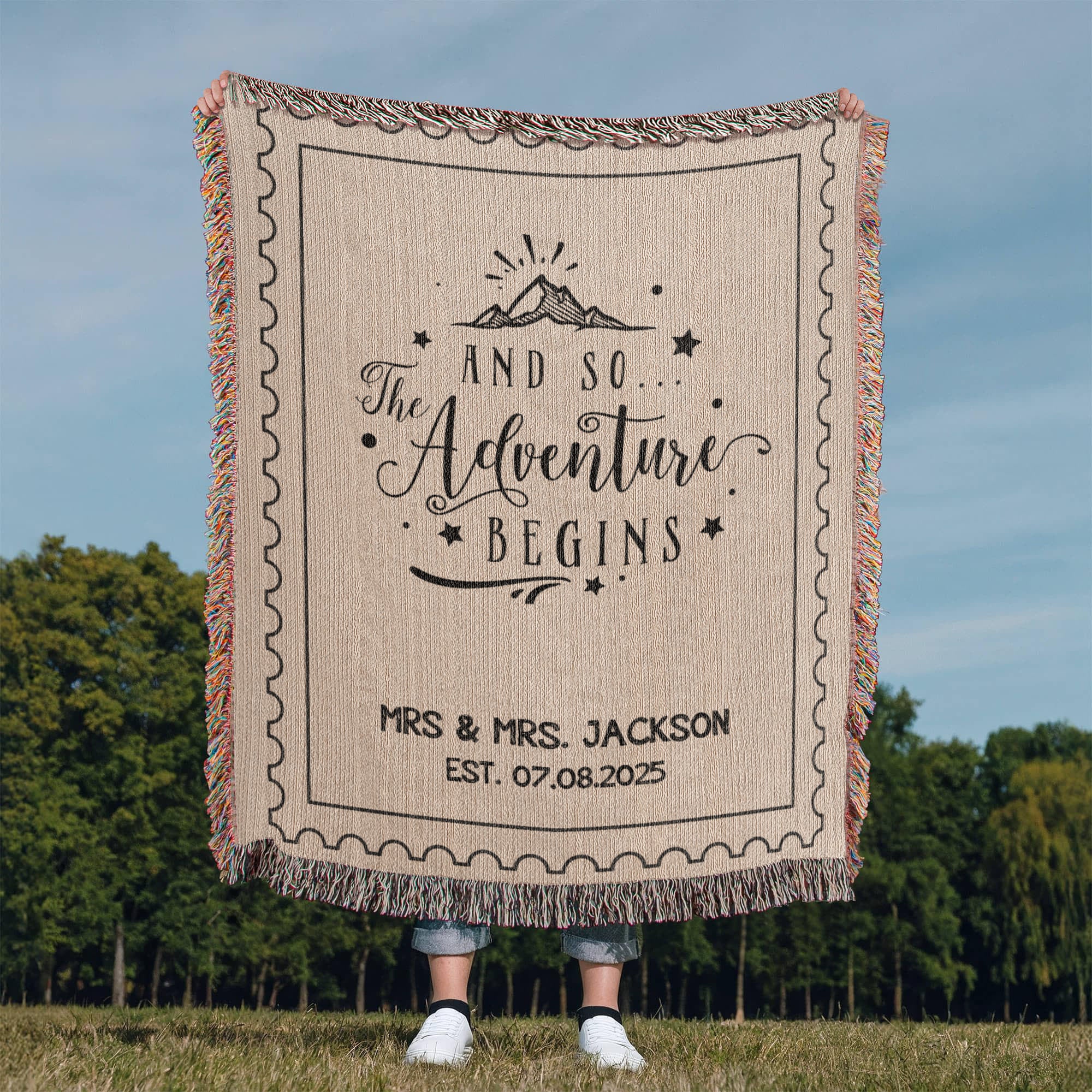 Personalized Wedding Blanket Custom Name Woven Throw, Adventure Begins Gift for Couple, Cotton Anniversary Keepsake Throw