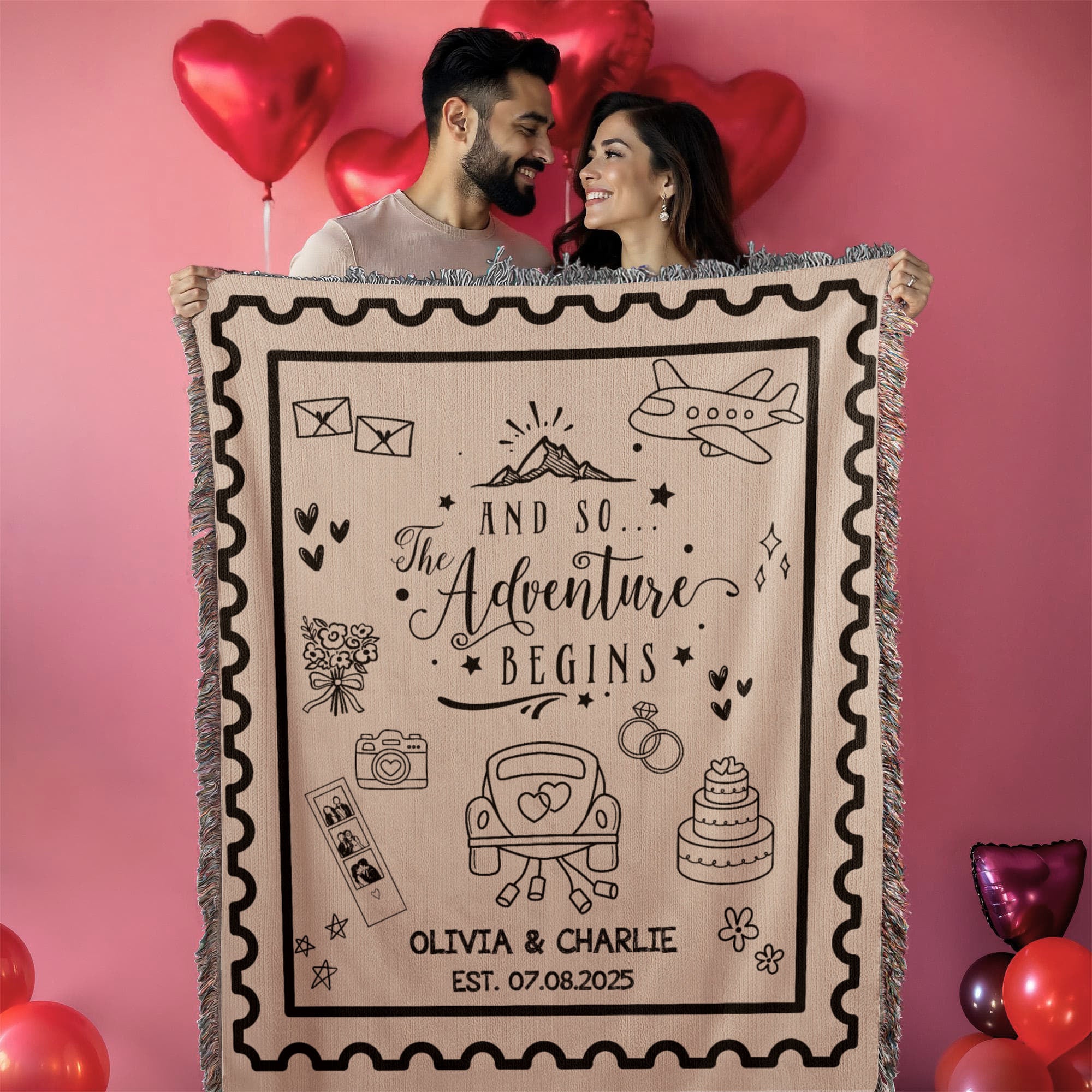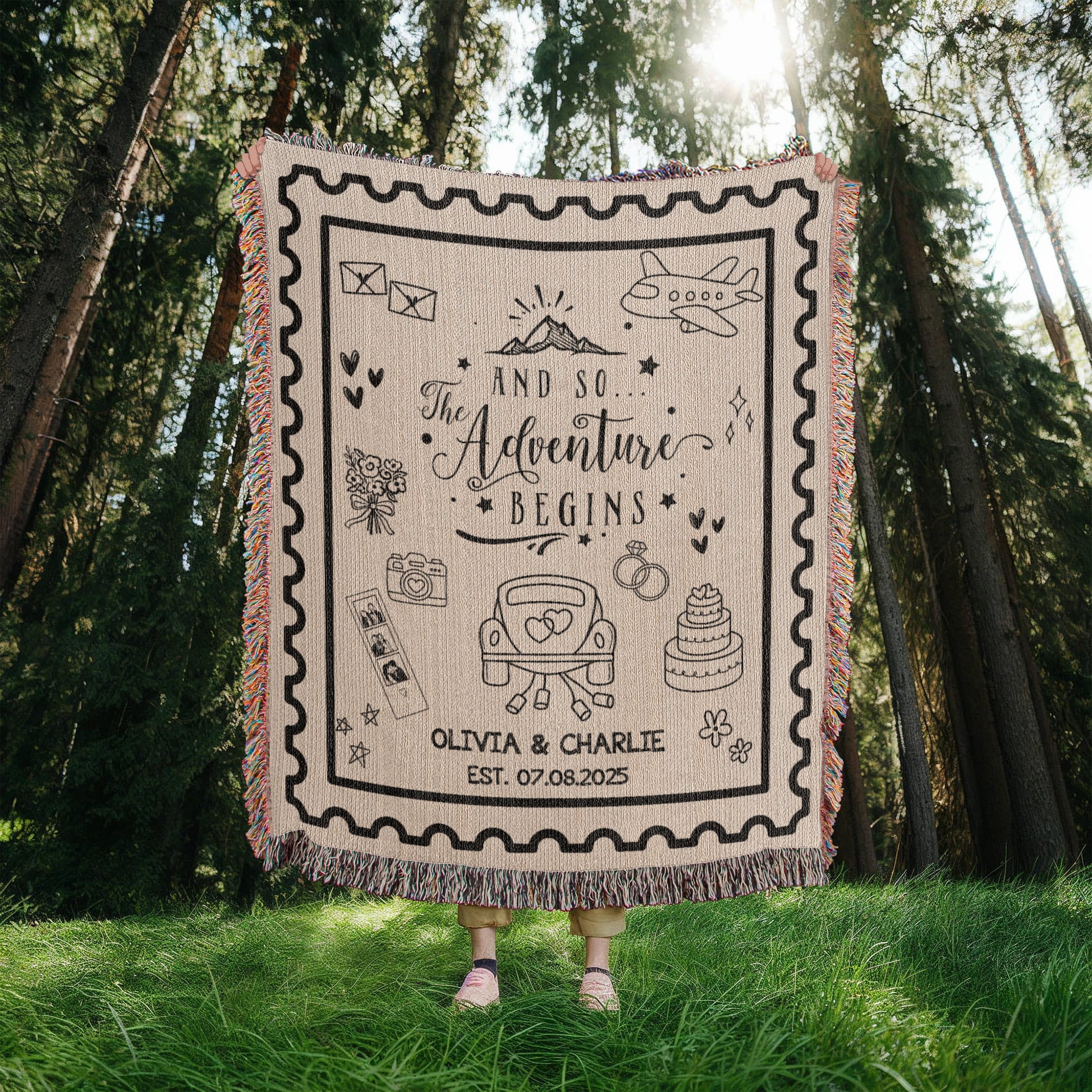 Personalized Wedding Blanket, Custom Names Wedding Gift Woven Throw, Hand Drawn Wedding Stamp Gift, Travel Gifts for Couple Keepsake, Wedding Souvenir