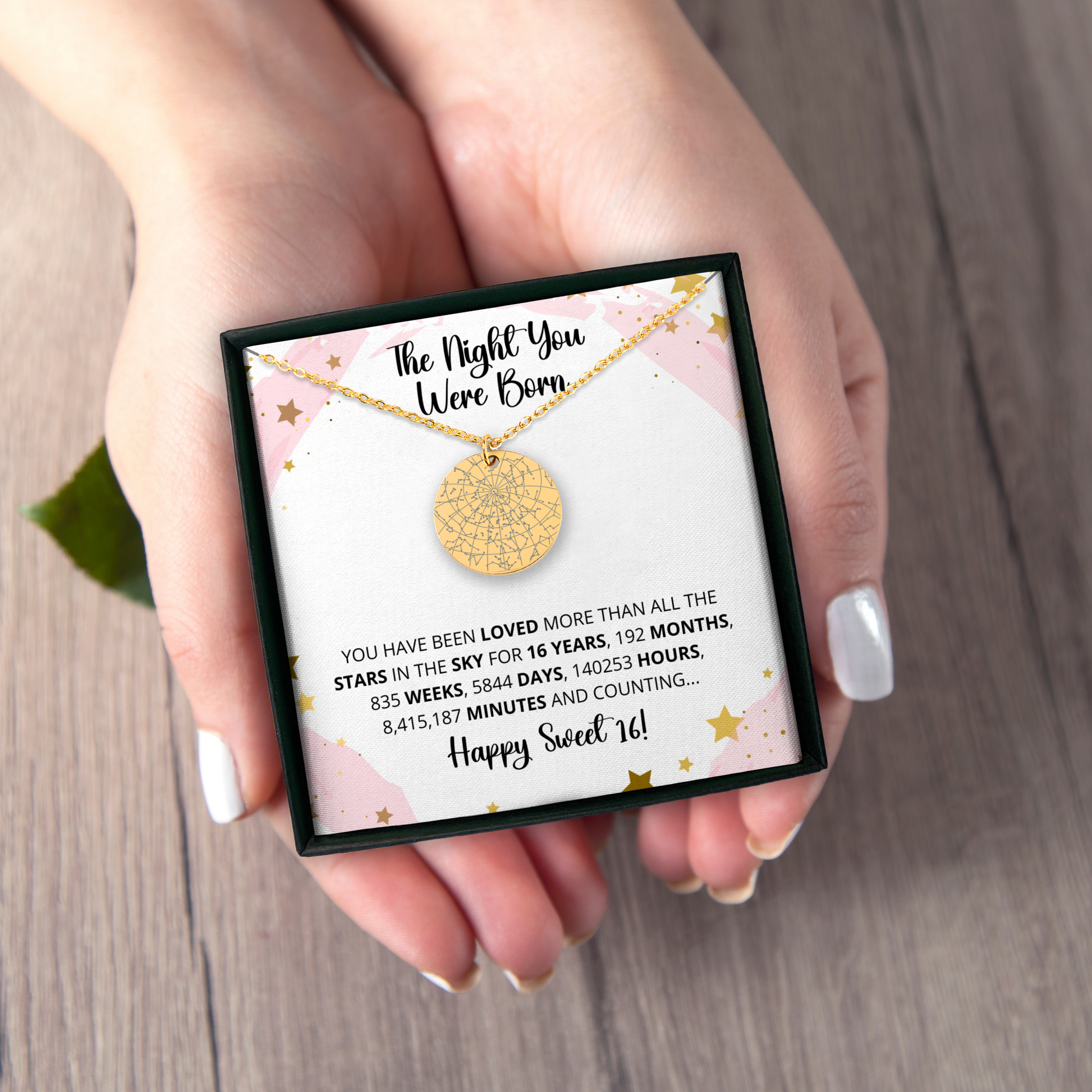 More than just a necklace…eternalize a special moment in your life with a custom star map necklace. Was it the day you met your soul-mate, the day you passed an important exam, the birth of a child or the day you realized your world has changed? Simply add a date and a place, and our designers will customize a star map that shows exactly how the sky was looking on that specific day, from that specific place. Optionally, you can choose to give the necklace an even more personal touch by adding a custom message or coordinates on the back. This necklace also makes the perfect gift for anniversaries, birthdays, couples & more.