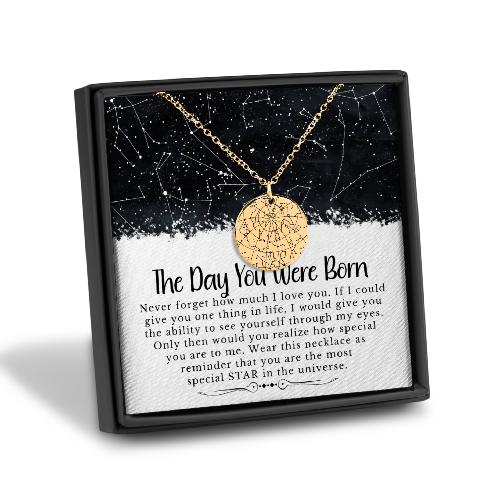 The custom star map is a glance at the heavens. Capturing the exact way the night stars looked at the location and date of your choice. It's a unique way to remember the special day. Imagine her face when she opens this gift, sees the personalized necklace and reads the heartfelt message...she'll melt!