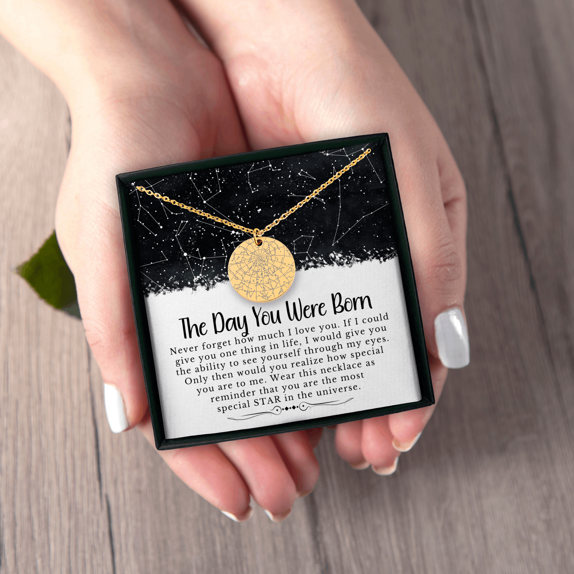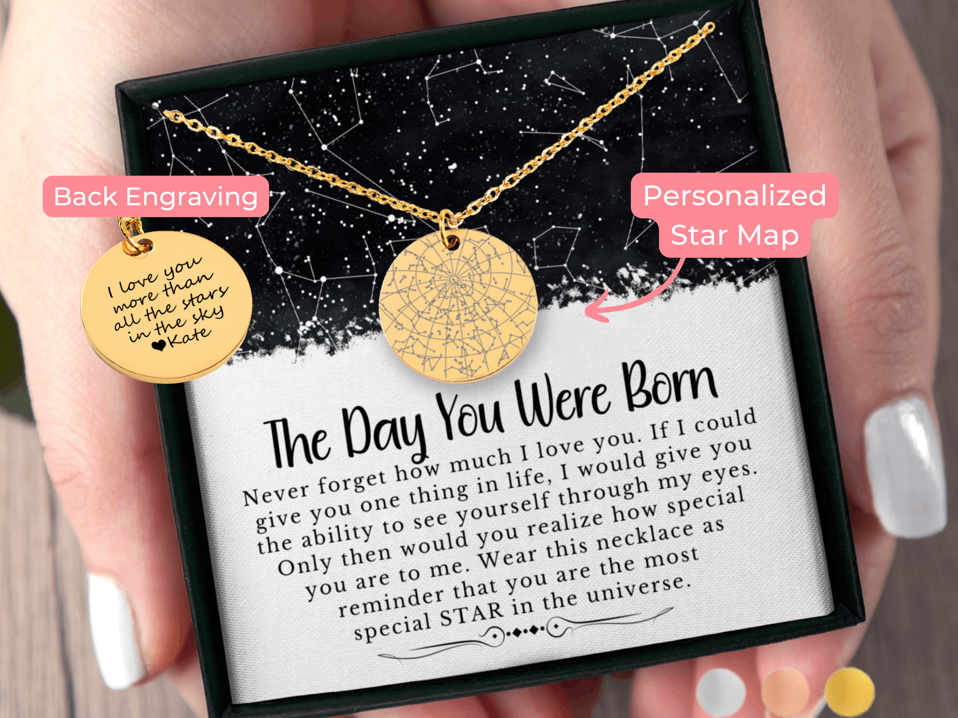 Celebrate her special day with this custom engraved charm necklace with a Star Map designed especially for her. It's the perfect unique Birthday gift, Graduation gift or Christmas gift! Simply add a special date and the place, and our designers will customize a star map that shows exactly how the sky was looking on that specific day, from that specific place. Optionally, you can choose to give this meaningful necklace an even more personal touch by adding a custom message, date, or coordinates on the back.