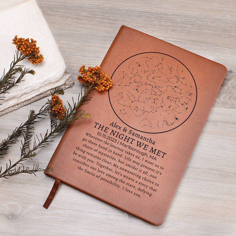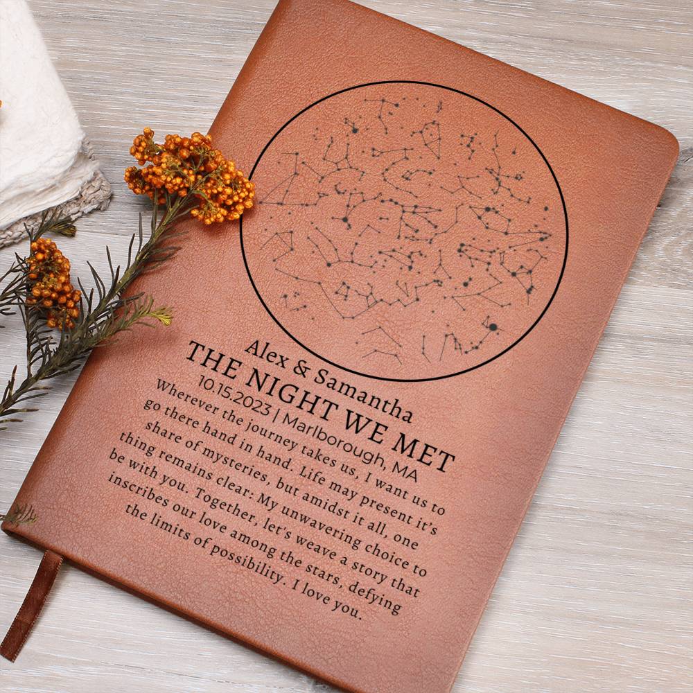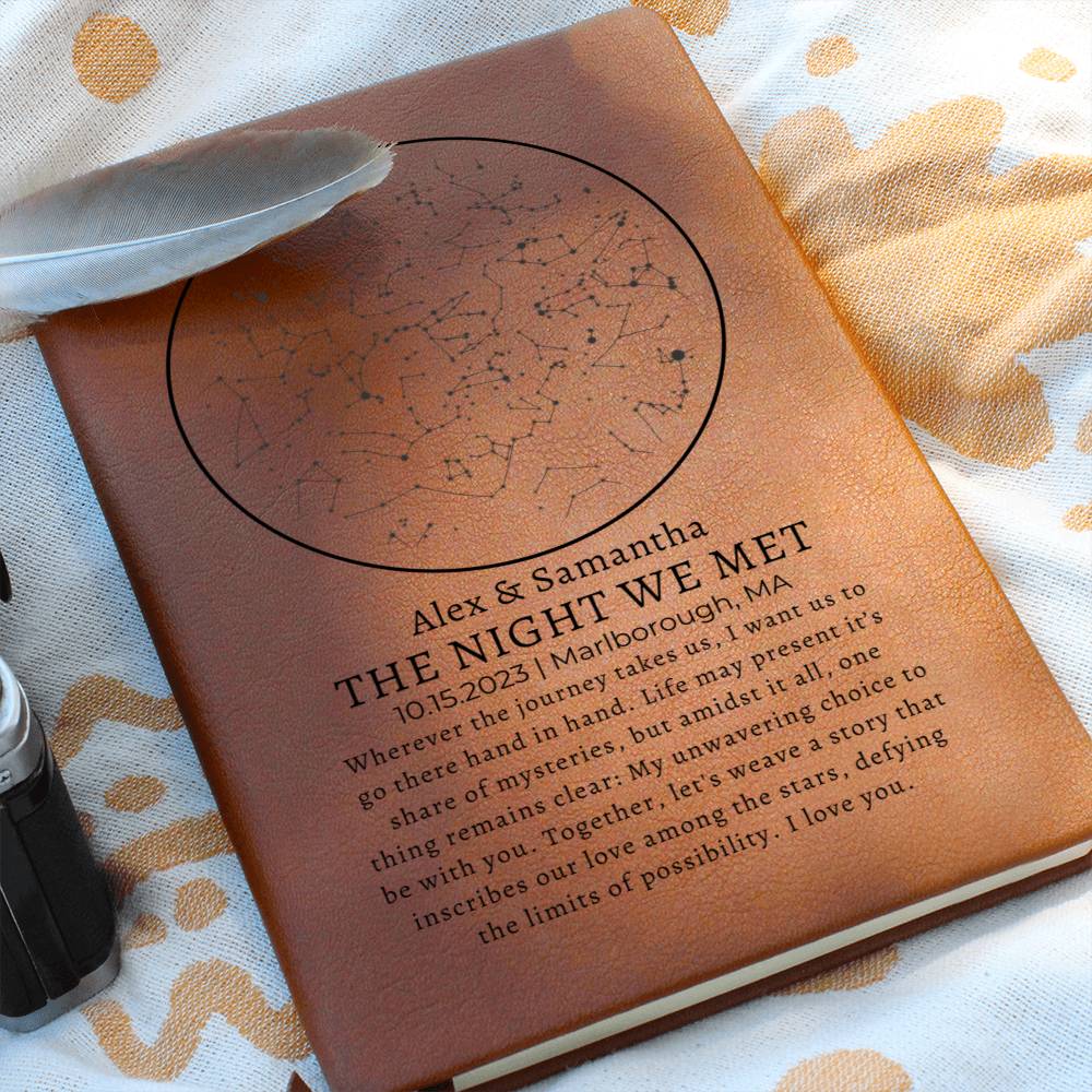 Show them how much you care with this romantic personalized Star Map Journal. This custom Star Map is designed especially for you. It's the perfect Anniversary gift, Birthday gift or Christmas gift! Simply add the date and place where your stars crossed, and our designers will customize a star map that shows exactly how the sky was looking on that specific day, from that specific place.