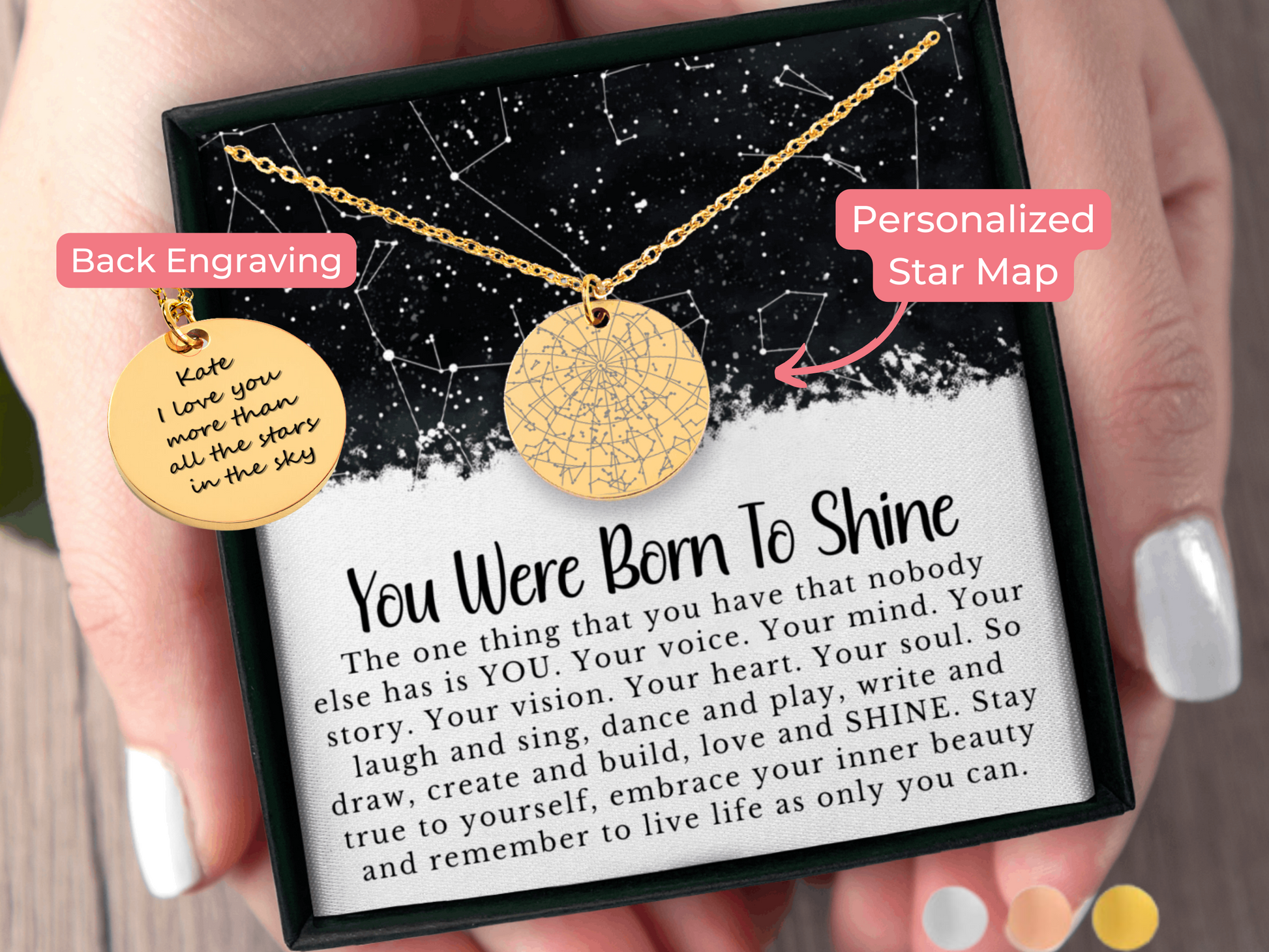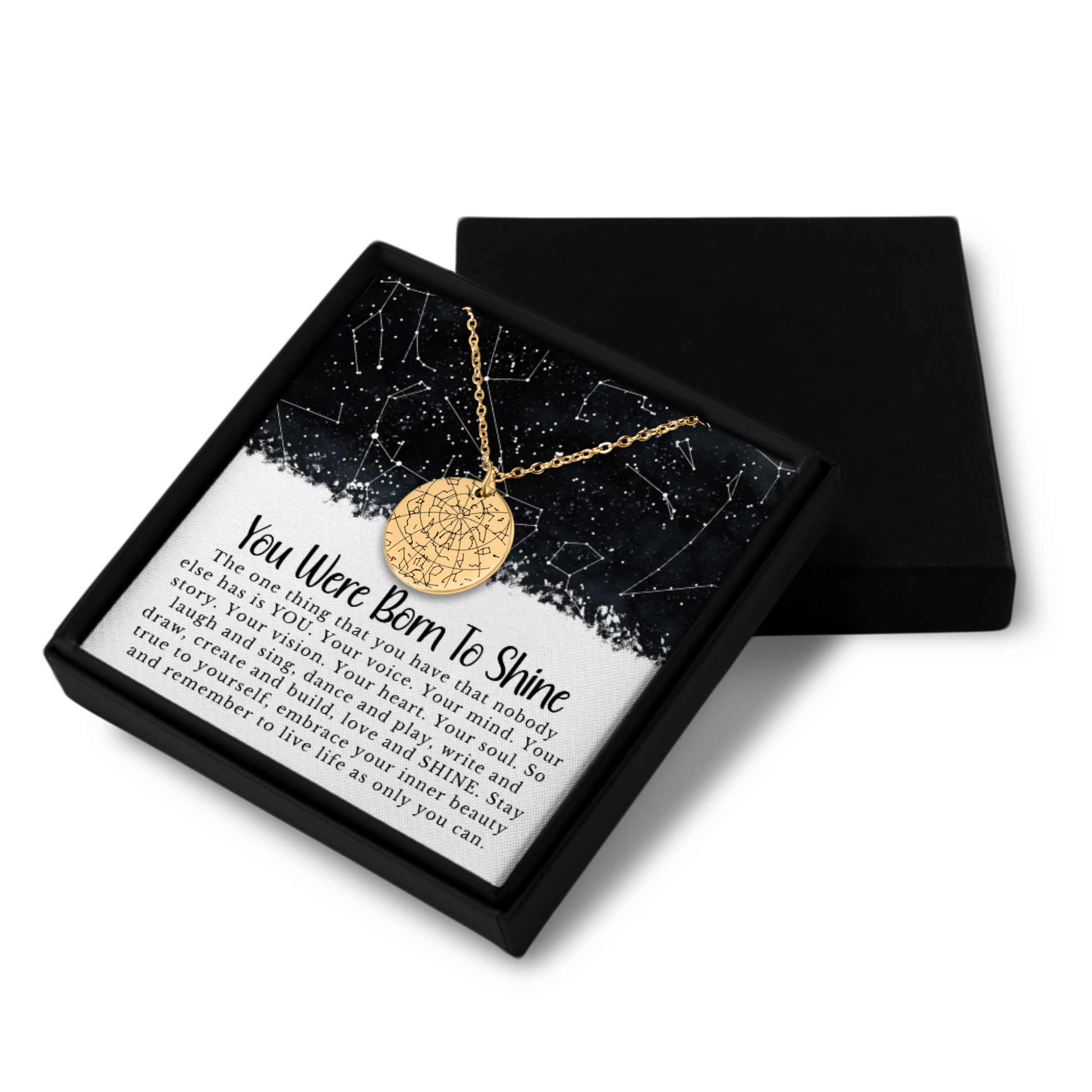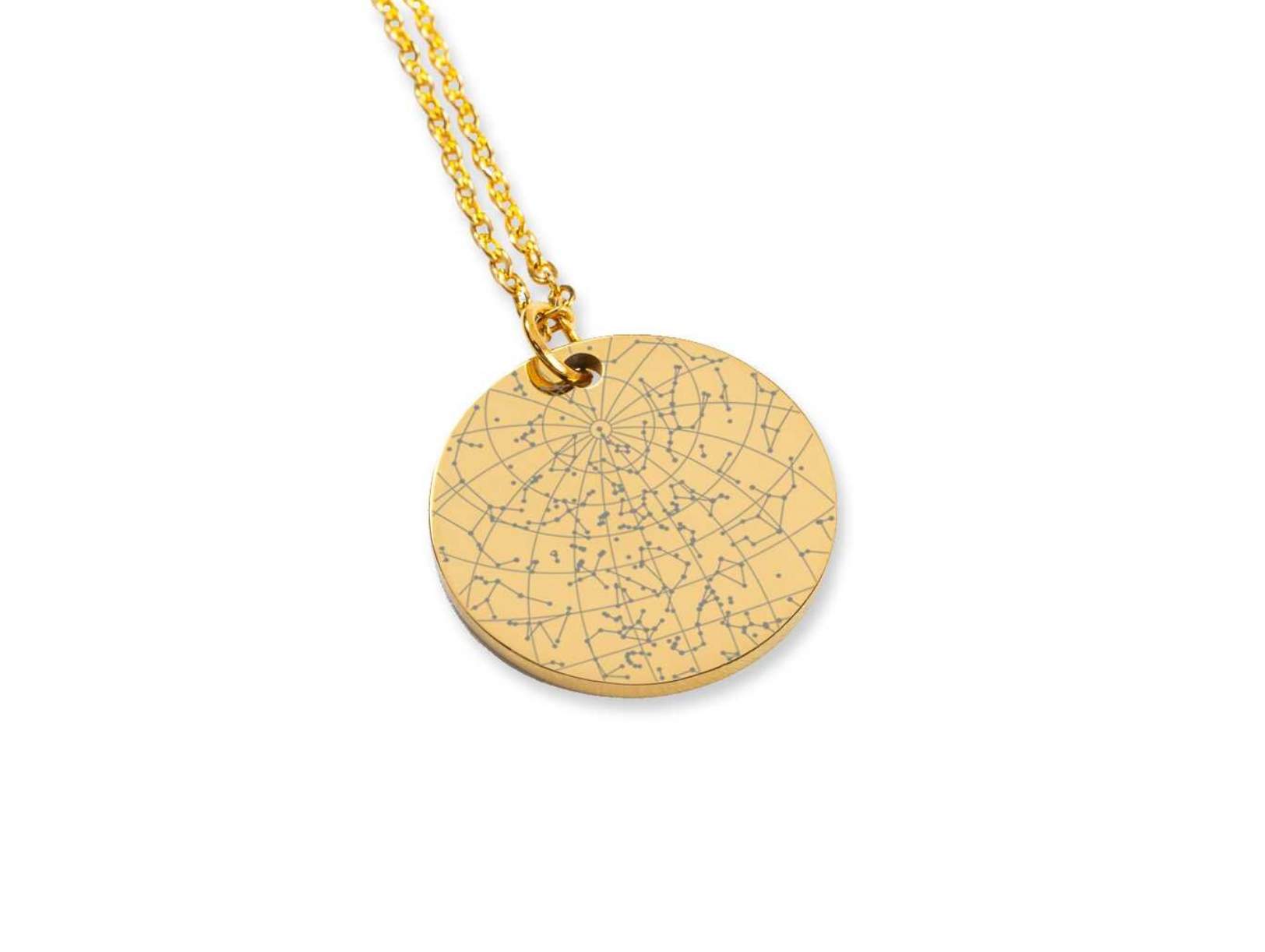 More than just a necklace…eternalize a special moment in your life with a custom star map necklace. Was it the day you met your soul-mate, the day you passed an important exam, the birth of a child or the day you realized your world has changed? Simply add a date and a place, and our designers will customize a star map that shows exactly how the sky was looking on that specific day, from that specific place. Optionally, you can choose to give the necklace an even more personal touch by adding a custom message or coordinates on the back. This necklace also makes the perfect gift for anniversaries, birthdays, couples & more.