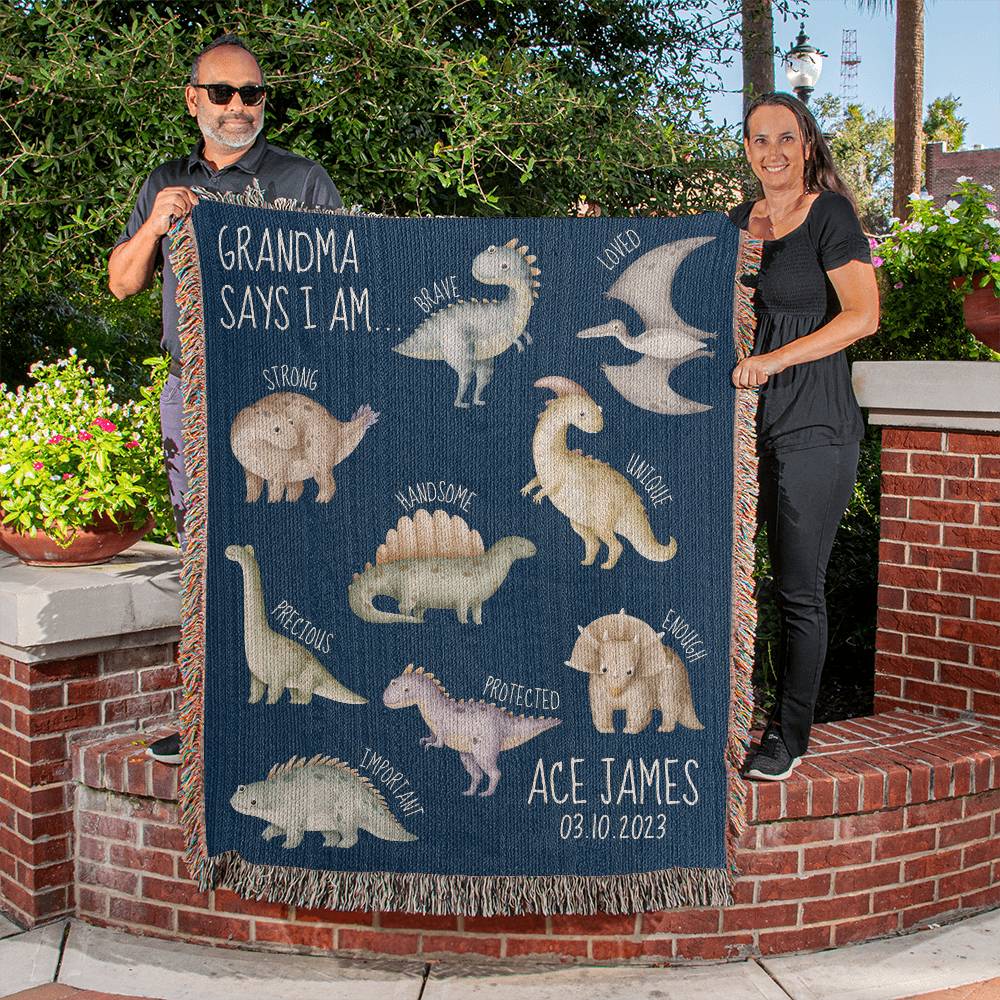 Wrap your grandson in love with this personalized name blanket, a heartwarming gift from Grandma or Grandpa. Crafted from 100% cotton yarn with a colorful fringe, this cozy blanket is customized with your grandson's name and birthdate, along with a special message like "Grandma says I am" or "Grandpa says I am"—or any name you choose! This unique keepsake will be cherished for years, celebrating the bond between grandparents and their grandchild.
