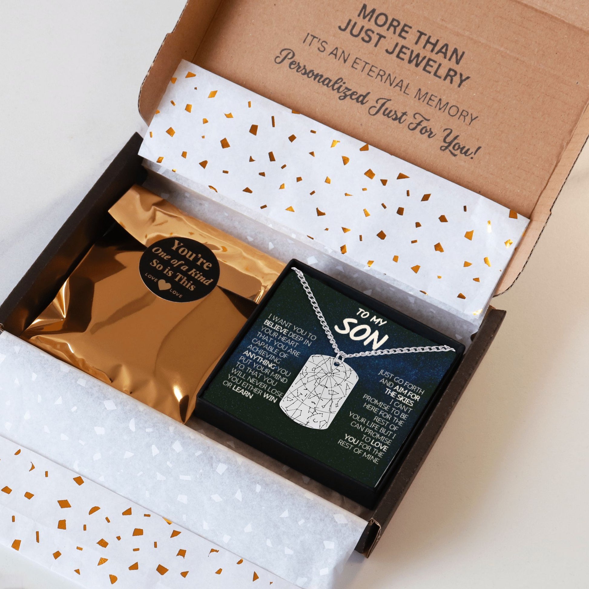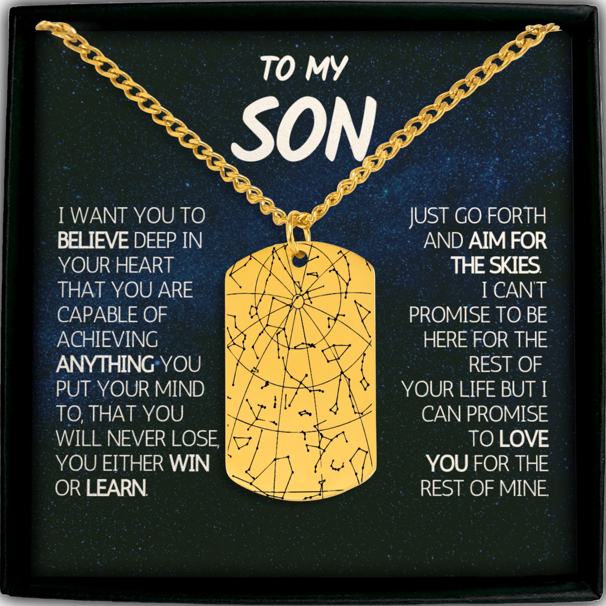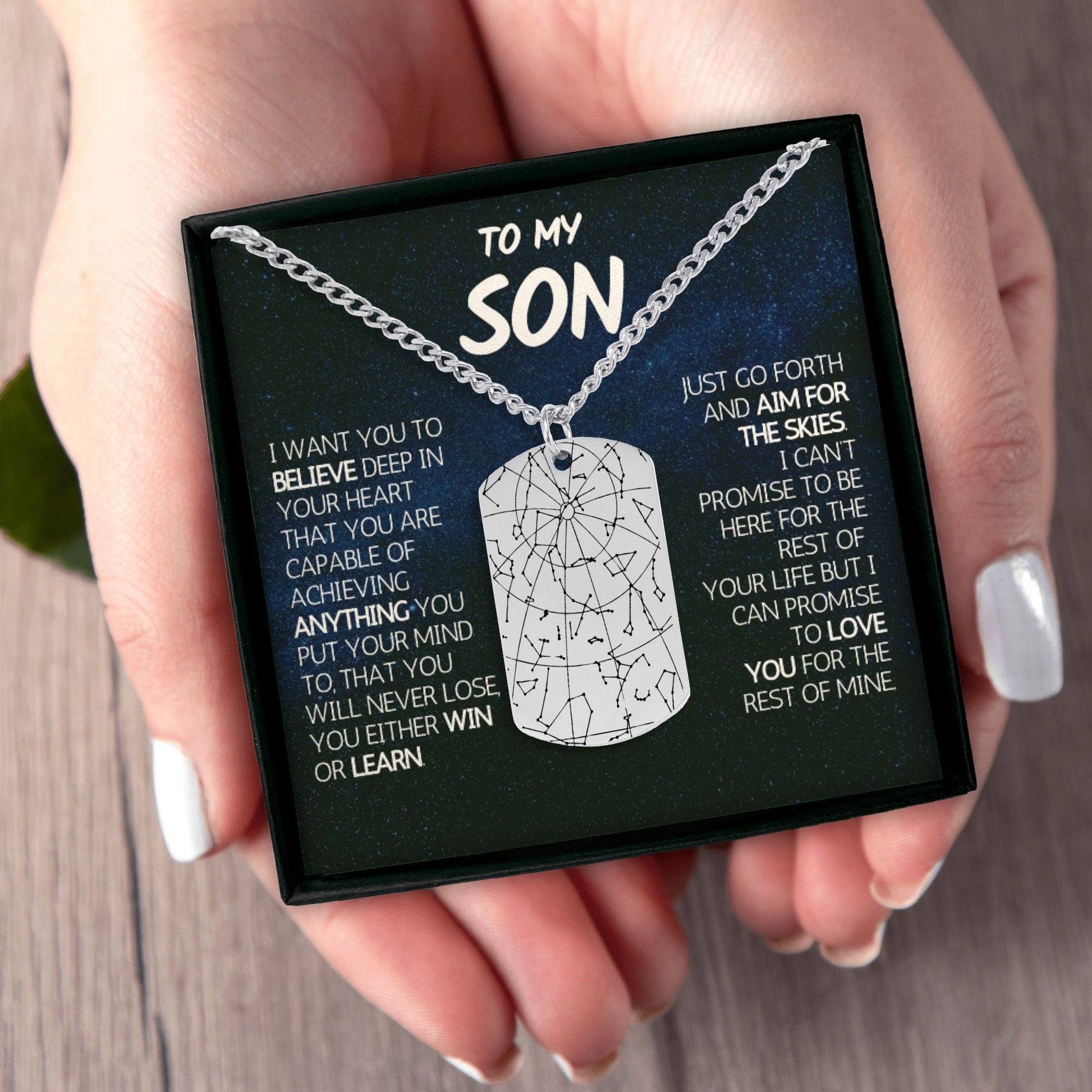 Show your son how much you love him with this personalized Star Map keychain. This custom engraved Star Map is designed especially for him. It's the perfect Birthday gift, Wedding Day gift or Christmas gift! Simply add the date and place where they were born, and our designers will customize a star map that shows exactly how the sky was looking on that specific day, from that specific place. Optionally, you can choose to give this meaningful keychain an even more personal touch by adding a custom message, date, or coordinates on the back. Imagine his face when he opens this gift, sees the personalized keychain and reads the heartfelt message...he'll melt!