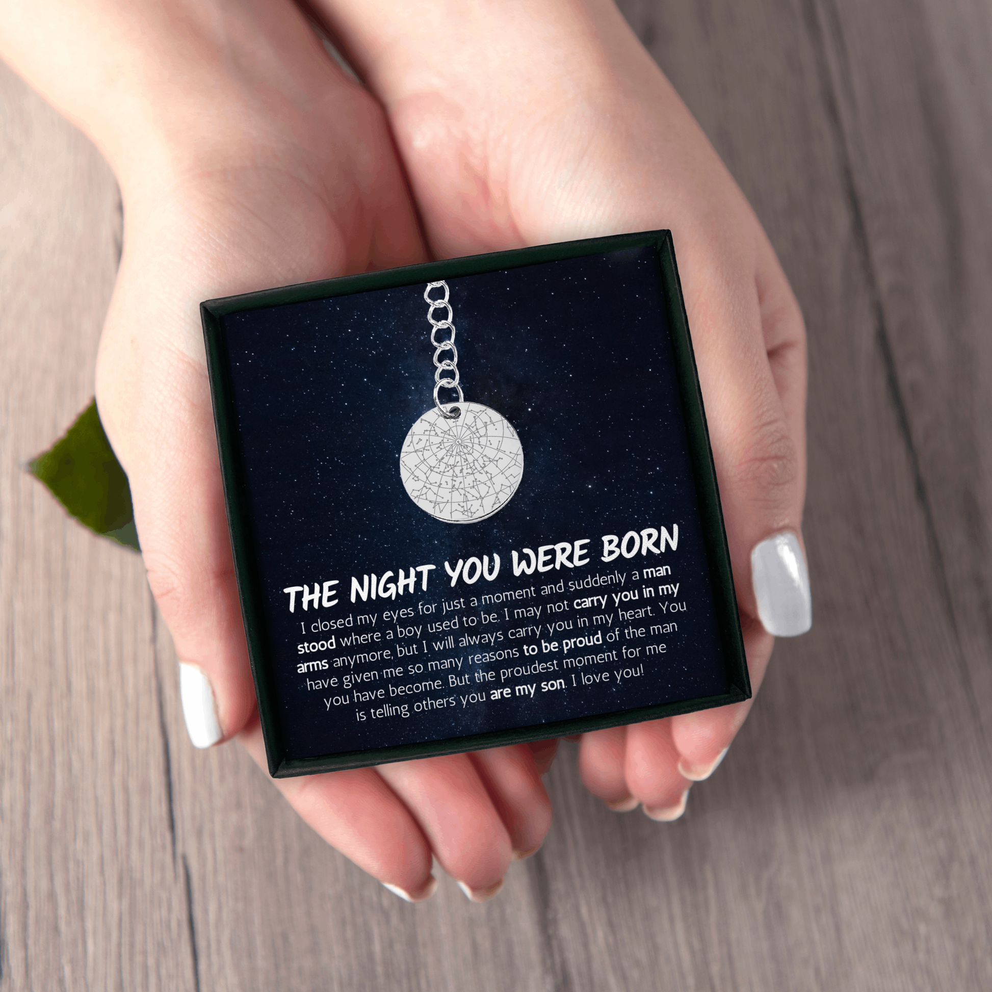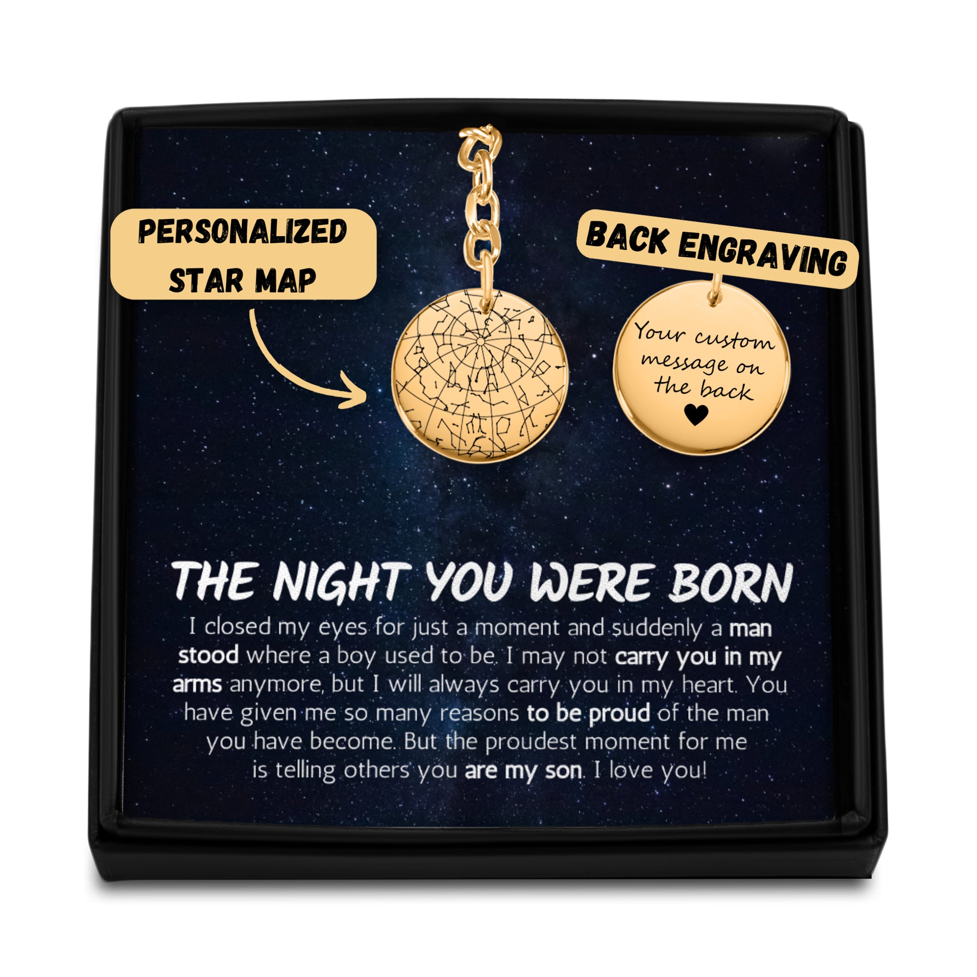 Show your son how much you love him with this personalized Star Map keychain. This custom engraved Star Map is designed especially for them. It's the perfect Birthday gift or Christmas gift! Simply add the date and place where they were born, and our designers will customize a star map that shows exactly how the sky was looking on that specific day, from that specific place. Optionally, you can choose to give this meaningful keychain an even more personal touch by adding a custom message, date, or coordinates on the back.