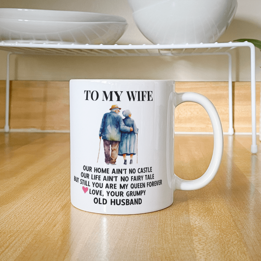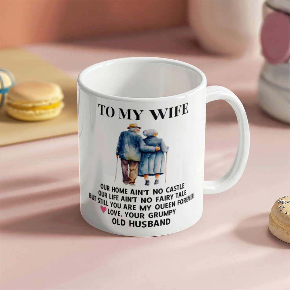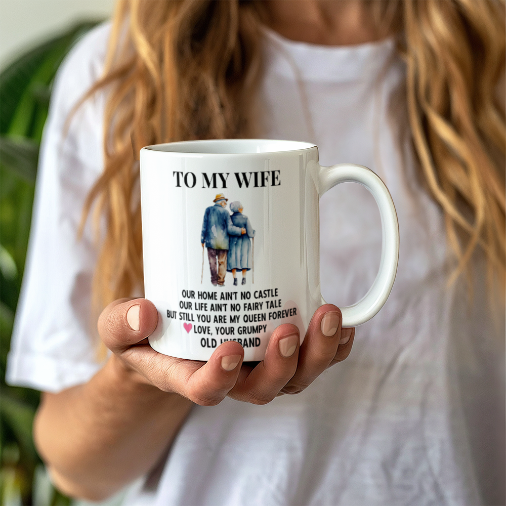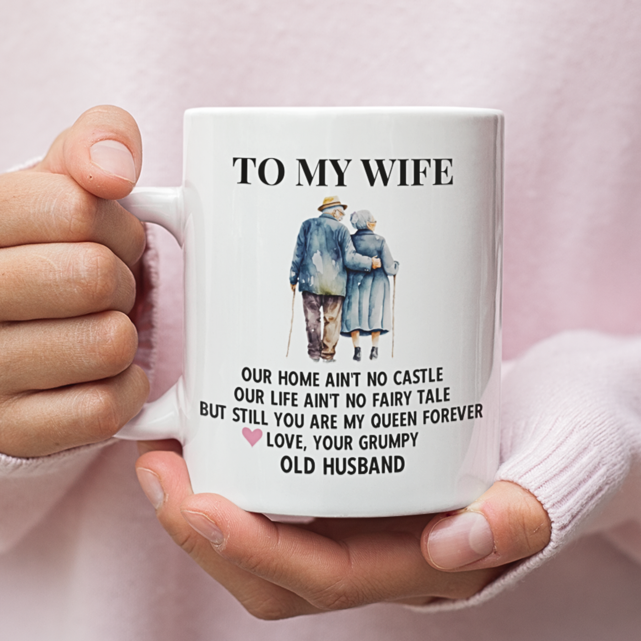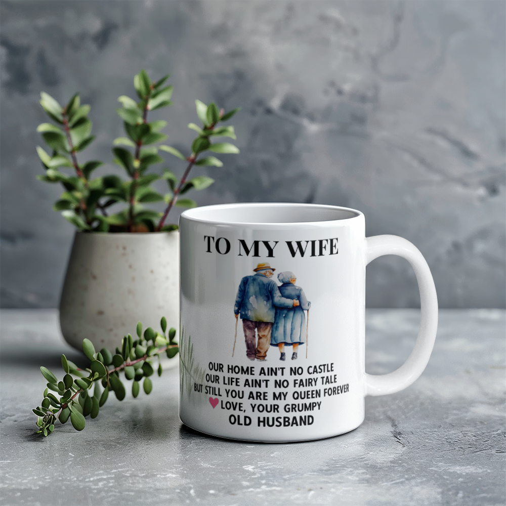 Show your wife just how much she means to you with this heartfelt mug. Perfect for the husband who knows that life isn't always a fairy tale, but his wife will always be his queen. This touching gift is a daily reminder of your love, even in the simplest moments. Make her smile with every sip, and remind her that, through it all, you're still her "grumpy old husband."