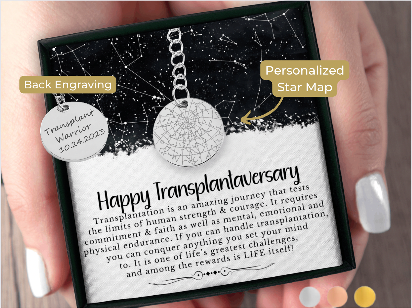 Show them how much you care with this personalized Star Map keychain. This custom engraved Star Map is designed especially for them. It's the perfect transplant gift! Simply add the special date and place, and our designers will customize a star map that shows exactly how the sky was looking on that specific day, from that specific place. Optionally, you can choose to give this meaningful keychain an even more personal touch by adding a custom message, date, or coordinates on the back.