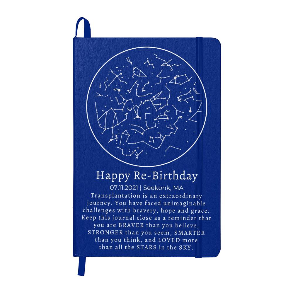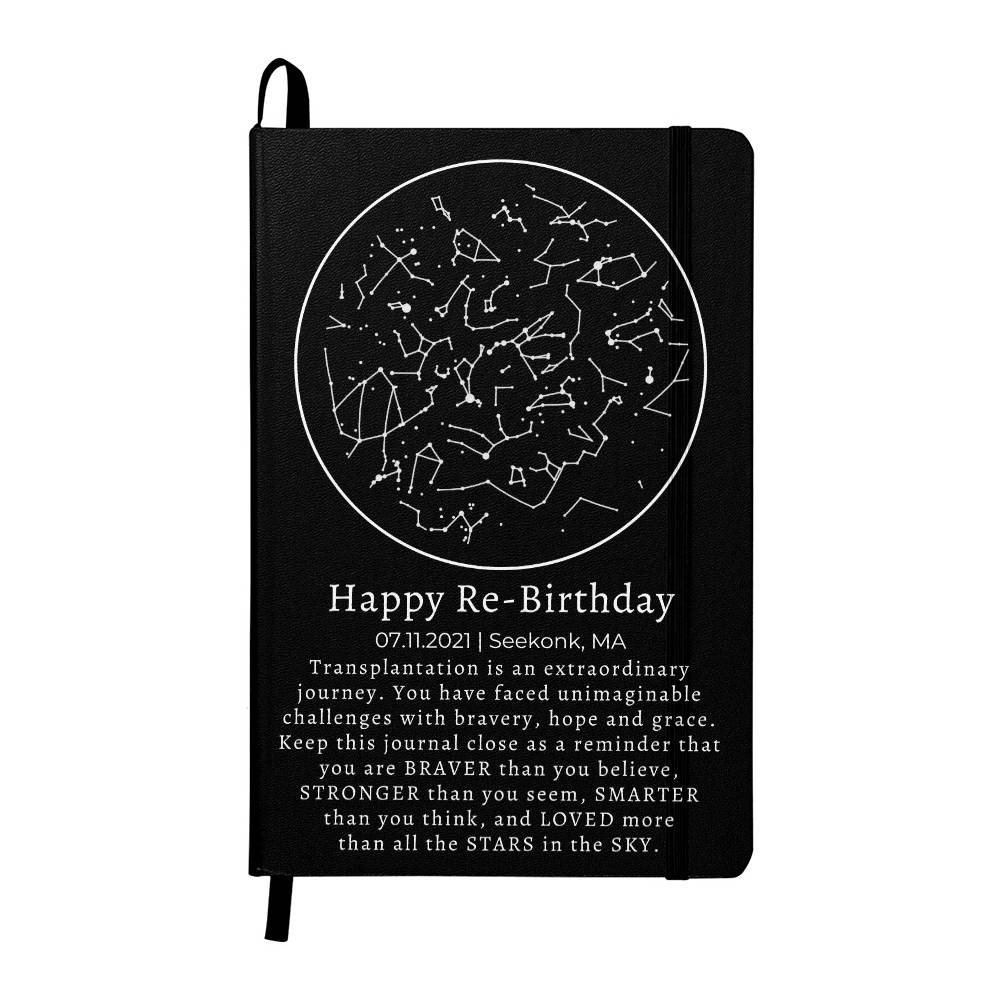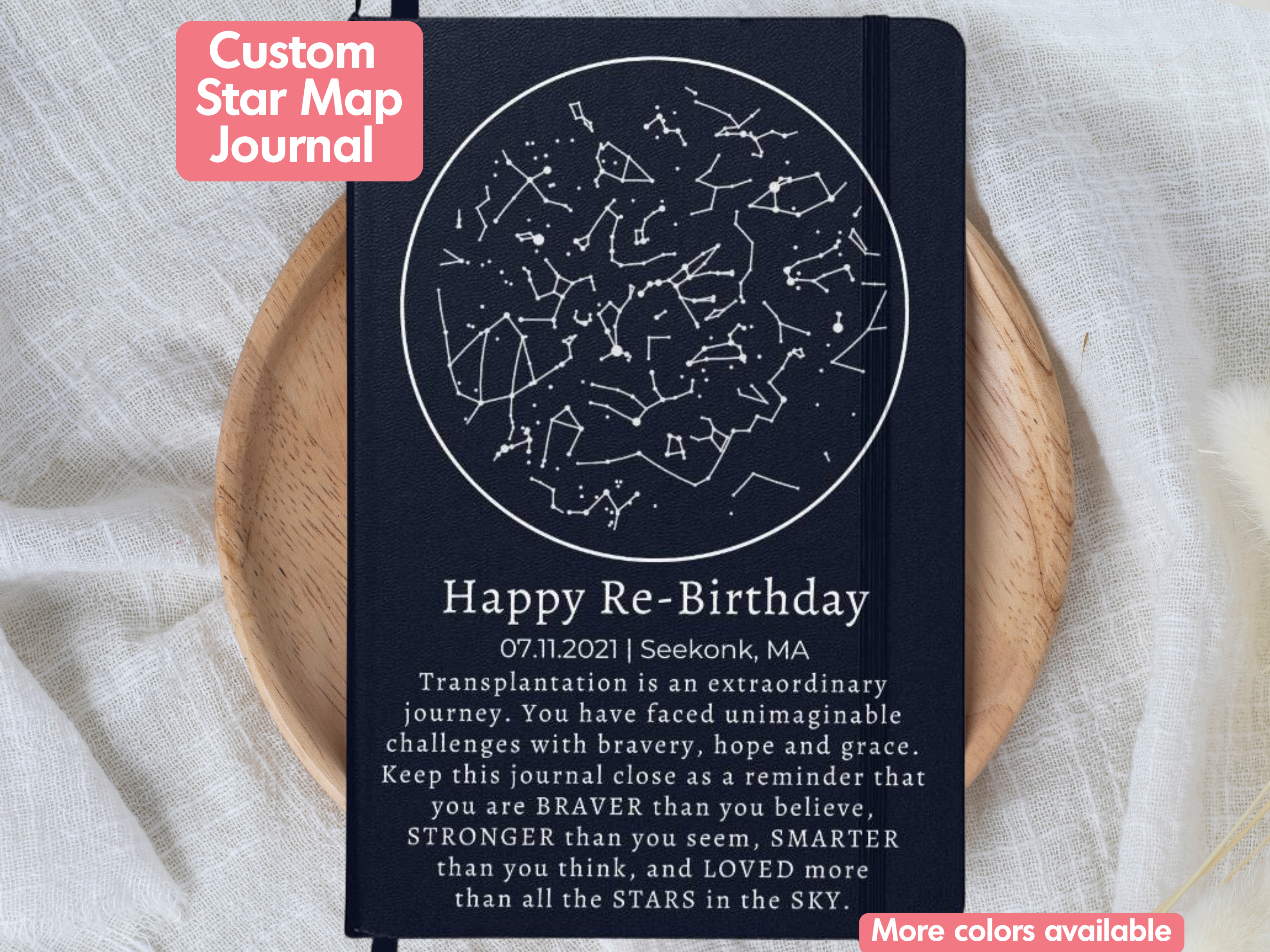 This custom star map journal by date is the perfect transplant anniversary gift, ReBirthday gift or Christmas gift! Simply add the special date and place and our designers will customize a star map that shows exactly how the sky was looking on that specific day, from that specific place.