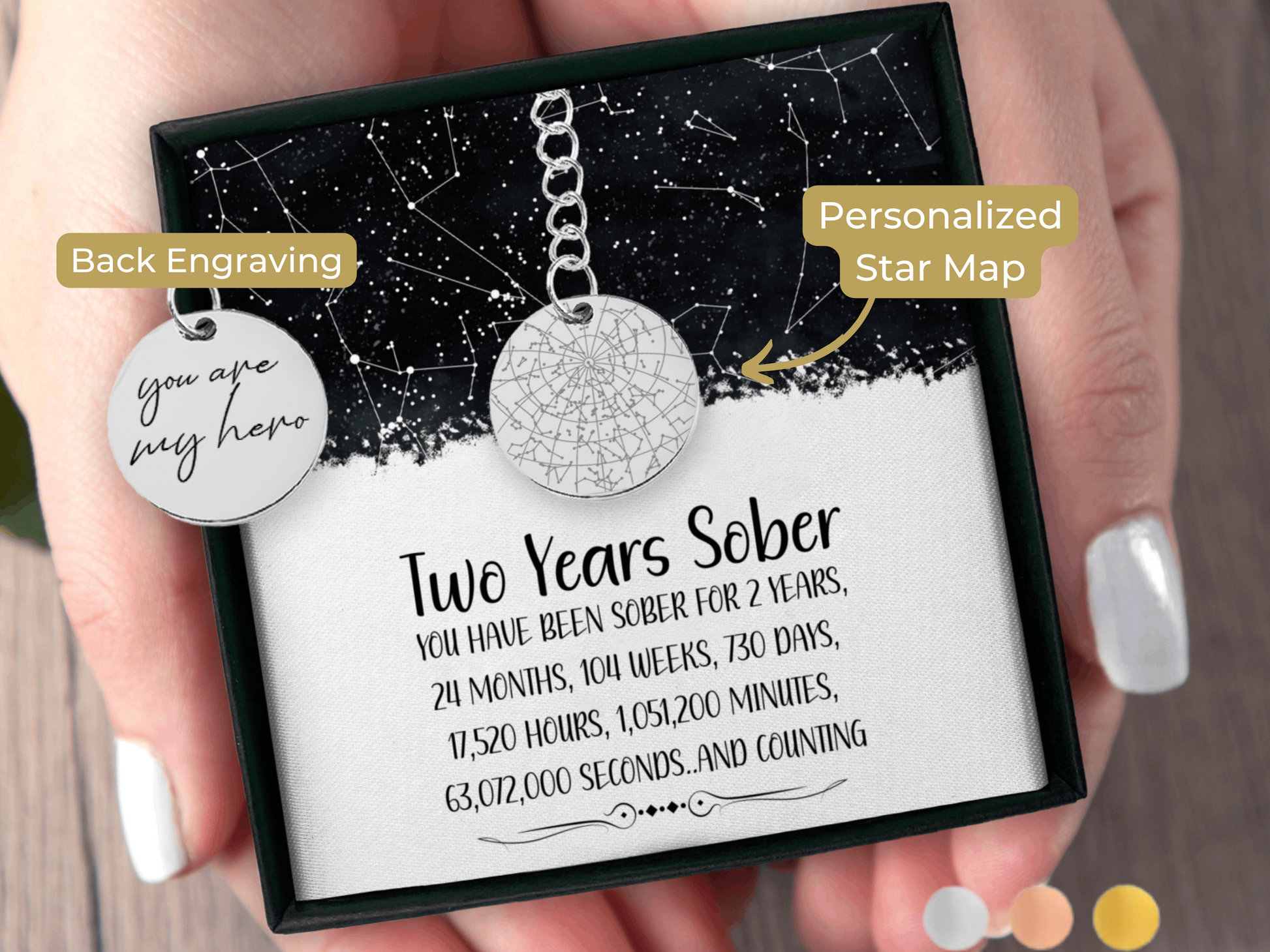 The custom star map is a glance at the heavens. Capturing the exact way the night stars looked at the location and date of your choice. It's a unique way to remember the special day she became sober. Imagine her face when she opens this gift, sees the personalized necklace and reads the heartfelt message...she'll melt!