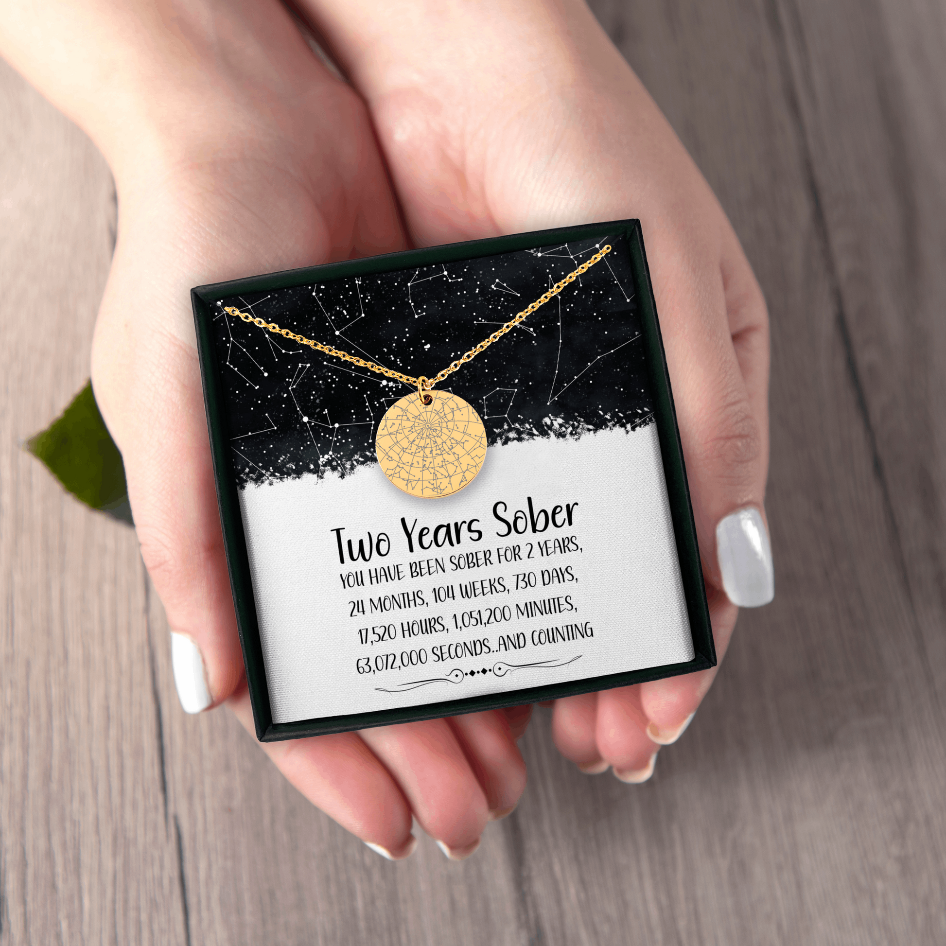 Show her how much you care and celebrate her progress with this personalized Sobriety Star Map Necklace. This custom engraved charm necklace with a Star Map is designed especially for her. It's the perfect Sober Anniversary gift, Birthday gift or Christmas gift! Simply add a date and the place she changed her life, and our designers will customize a star map that shows exactly how the sky was looking on that specific day, from that specific place. Optionally, you can choose to give this meaningful necklace an even more personal touch by adding a custom message, date, or coordinates on the back.